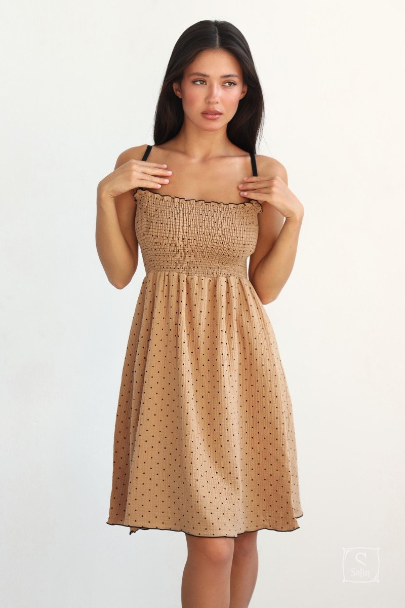 Мусліновий короткий сарафан German Volf 24147 коричневого кольору в горошок – це поєднання елегантності, романтики та природного комфорту, створене для літніх днів та вечорів. Виконаний з натурального бавовняного мусліну, цей сарафан дарує відчуття легкості та прохолоди навіть у спеку. Муслін - це м'яка, повітряна тканина, що чудово дихає, дозволяючи шкірі залишатися свіжою, а натуральний склад забезпечує приємні відчуття протягом усього дня.