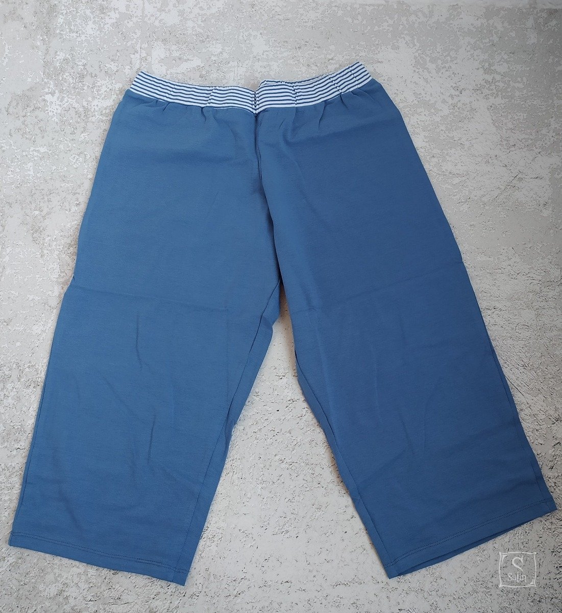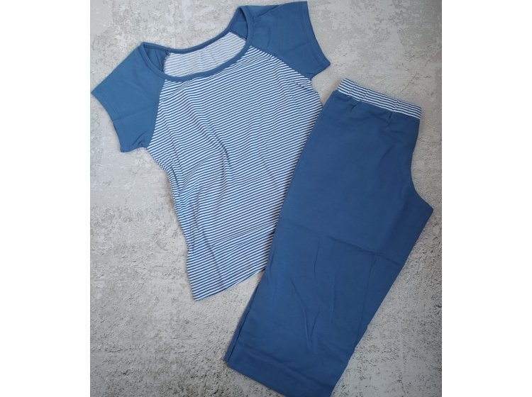 Піжама жіноча EGO P 01 складається з футболки з коротким рукавом та бриджів. Футболка в стилі реглан комбінована (біла смужка+синій), бриджі - сині. Виготовлена із бавовняного трикотажу. Є чудовим зручним і ошатним одягом для дому та сну.