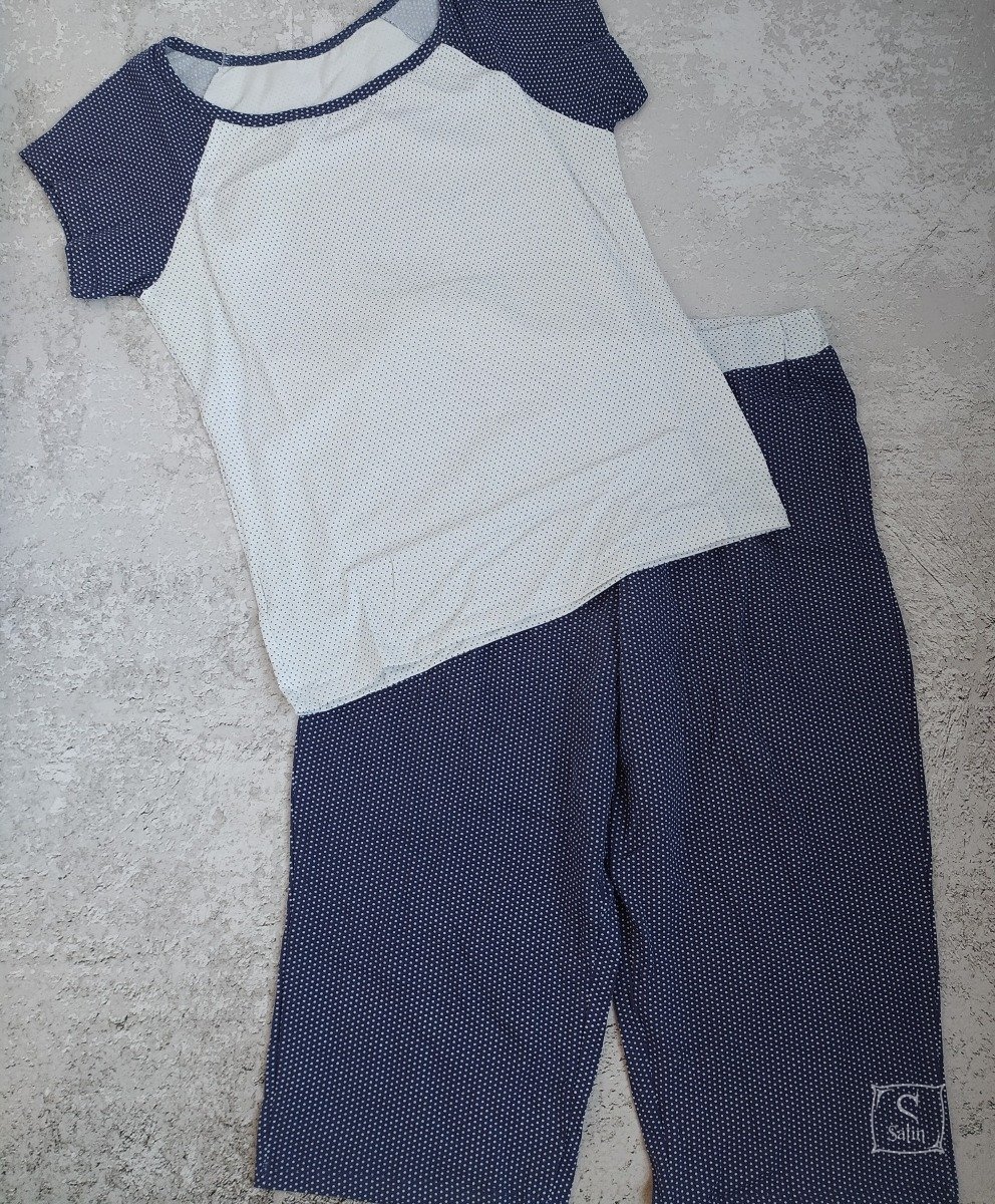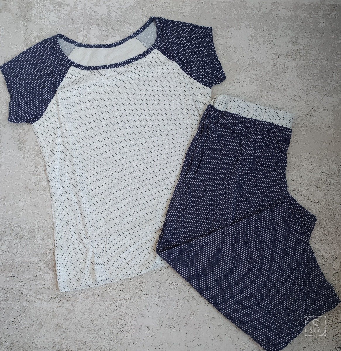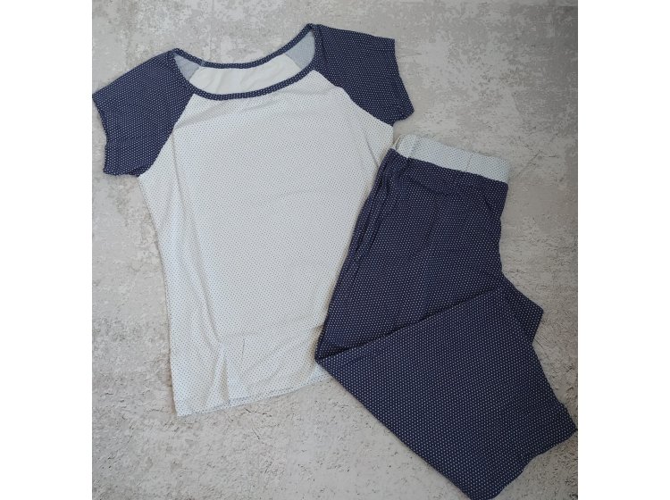Піжама жіноча EGO P 02 складається з футболки з коротким рукавом та бриджів. Футболка в стилі реглан комбінована (білий дрібний горох на чорному тлі+білий у чорний горошок), бриджі - чорні у білий горошок. Виготовлена із бавовняного трикотажу. Є чудовим зручним і ошатним одягом для дому та сну.