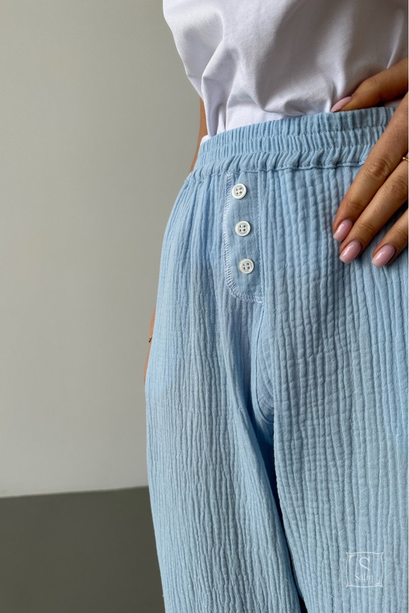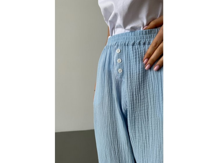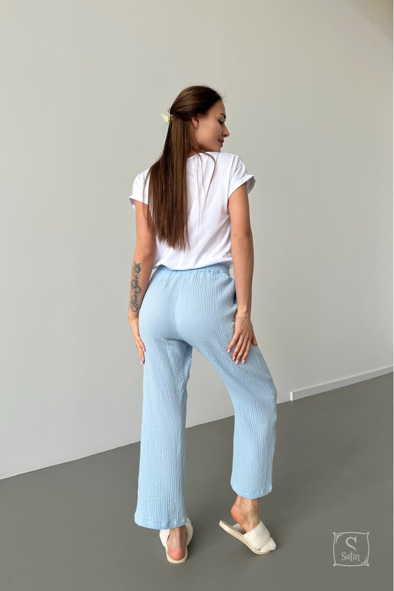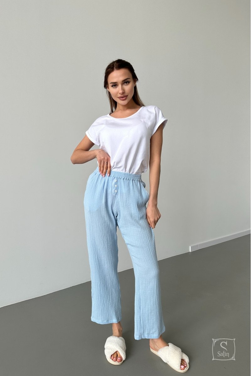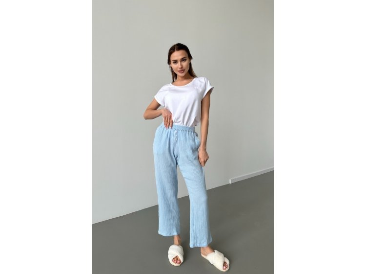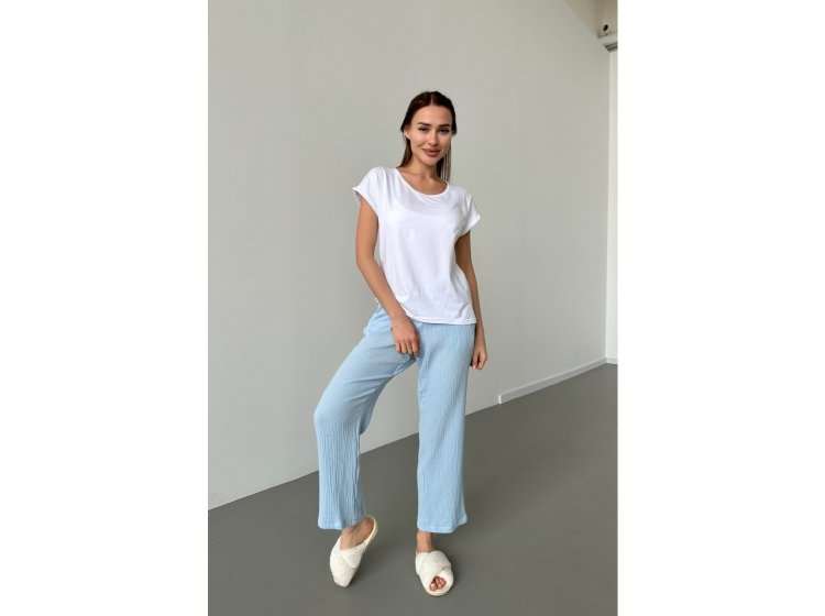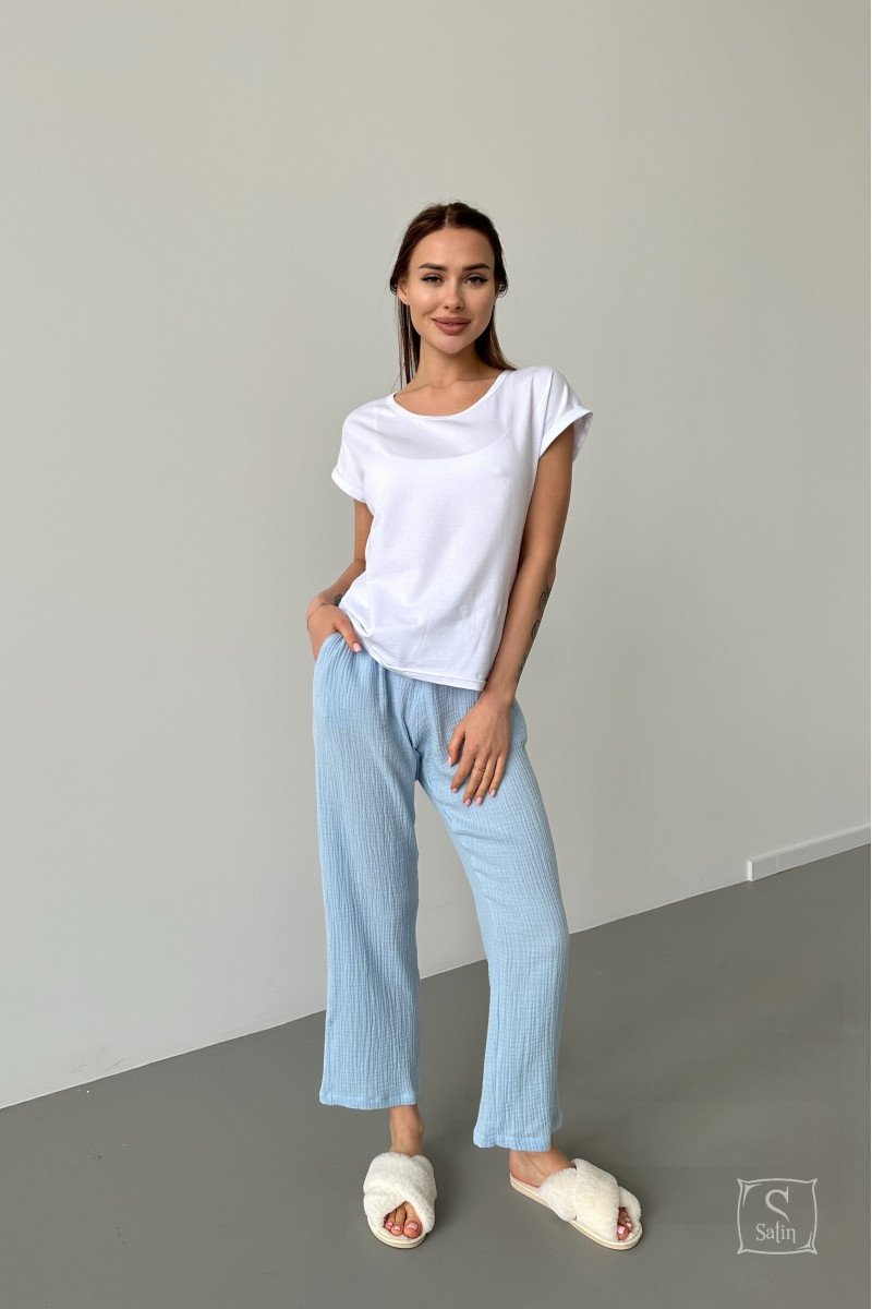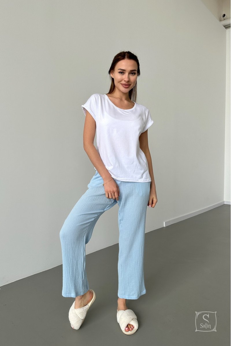 Піжамний комплект German Volf 24035 включає білу футболку і муслінові штани. Футболка виконана з м'якого та приємного до тіла матеріалу, забезпечуючи комфорт та свободу рухів. Футболка базова, може бути носима як вдома, так і на прогулянці. Штани з мусліну мають легкість і добре дихають, що робить їх відмінним варіантом для сну або відпочинку. Цей піжамний комплект поєднує стиль, зручність і якість, які подарують вам приємні моменти відпочинку і комфорту.