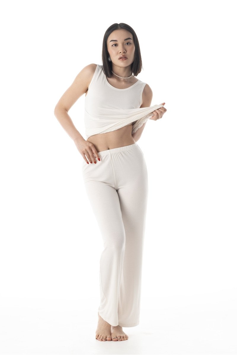 Молочний колір надає штанам ніжності та елегантності, створюючи спокійну атмосферу, ідеальну для відпочинку. Цей універсальний відтінок підходить для будь-якого типу шкіри, надаючи образу природної свіжості та легкості. Молочний колір гармонійно поєднується з іншими елементами домашнього гардеробу, такими як піжамні топи або халати, що дозволяє створювати стильні домашні комплекти. У той же час цей відтінок надає почуття чистоти та спокою, що сприяє розслабленню після довгого дня.