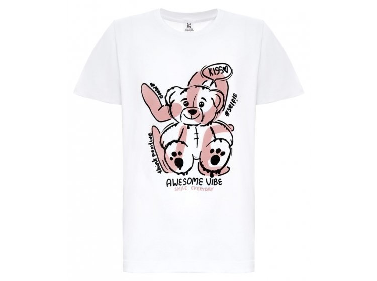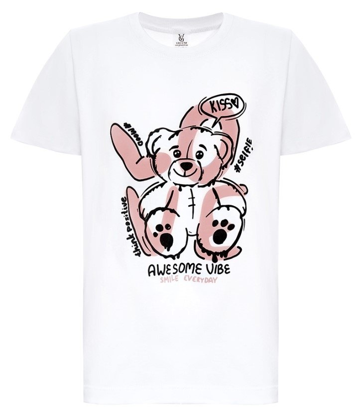 Футболка виконана з м'якої, приємної на дотик тканини, яка чудово пропускає повітря, створюючи відчуття свіжості. Білий колір футболки у поєднанні з рожевим принтом надає грайливості та ніжності в образ, наголошуючи на індивідуальності маленької модниці. Легкий та вільний крій футболки не обмежує руху, що особливо важливо для активних дівчаток. Ця футболка легко одягається і знімається, що робить її зручною для повсякденного носіння.
