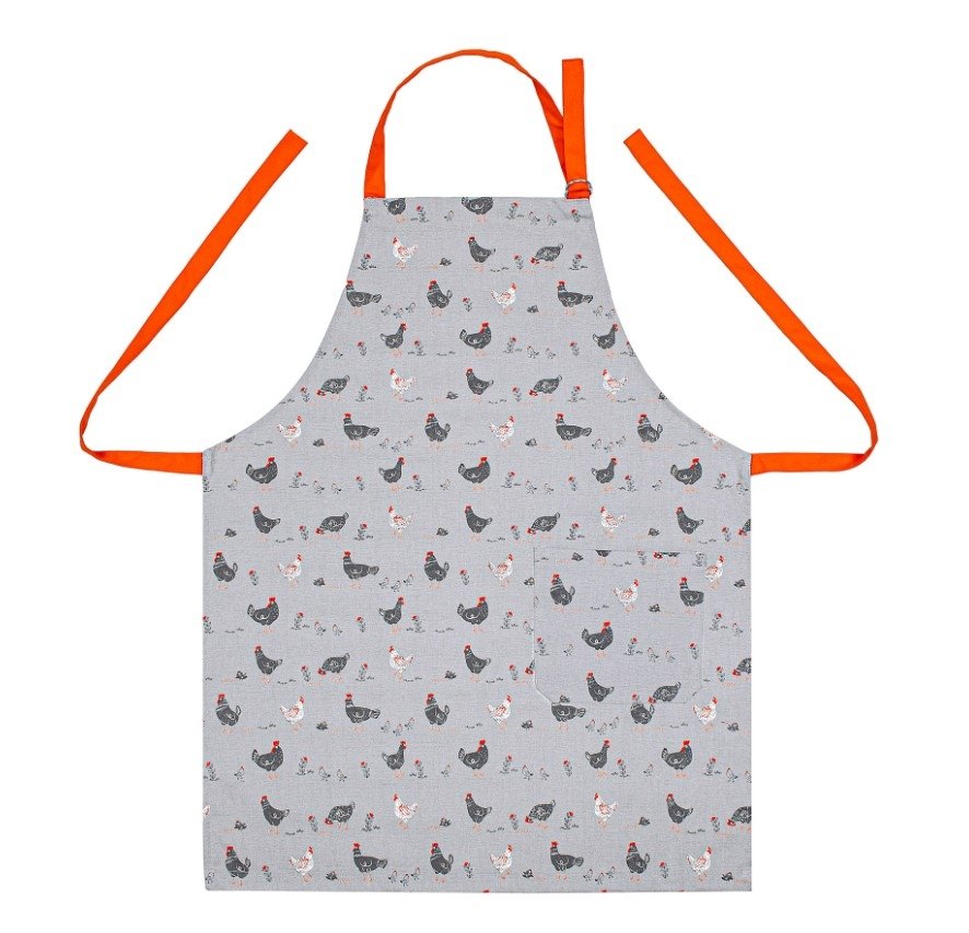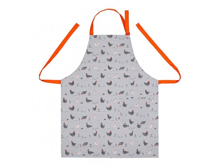 Фартух із регульованою зав'язкою Home Line "Прогулянка з курчатами" виконаний у сіро-жовтогарячих тонах з візерунком курочки і курчата .