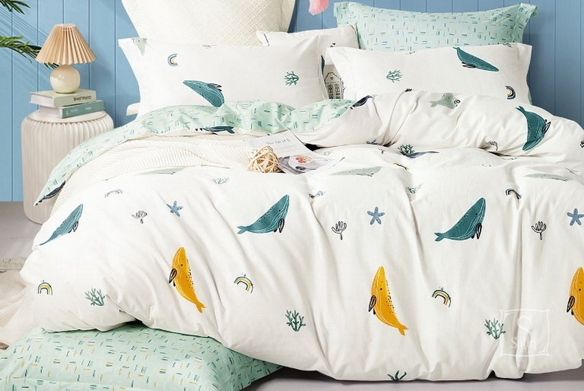 • Комплект постільної білизни Сатин JY2689. Бавовняна тканина (сатин), біло-зеленого кольору з малюнком кити. Цікавий дизайн прикрасить Ваш інтер'єр та подарує настрій. Найвища якість для найвибагливіших споживачів;