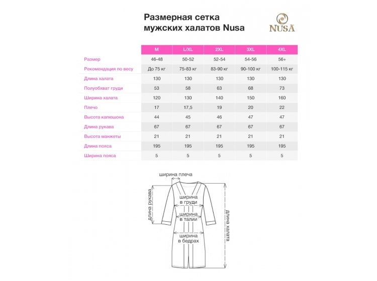 Халат виконаний з велюрової махри (50% бамбук, 50% бавовна), такий склад оптимальний для домашнього одягу - халат легкий, в той же час зберігає всі переваги бавовни, ворс короткий, щільний, із легким блиском. Поли халата утримуються зручним широким поясом, який має 2 положення для різного зростання. Рукави подовжуються до 10 см.Можна використовувати в якості банного виробу або домашнього одягу.