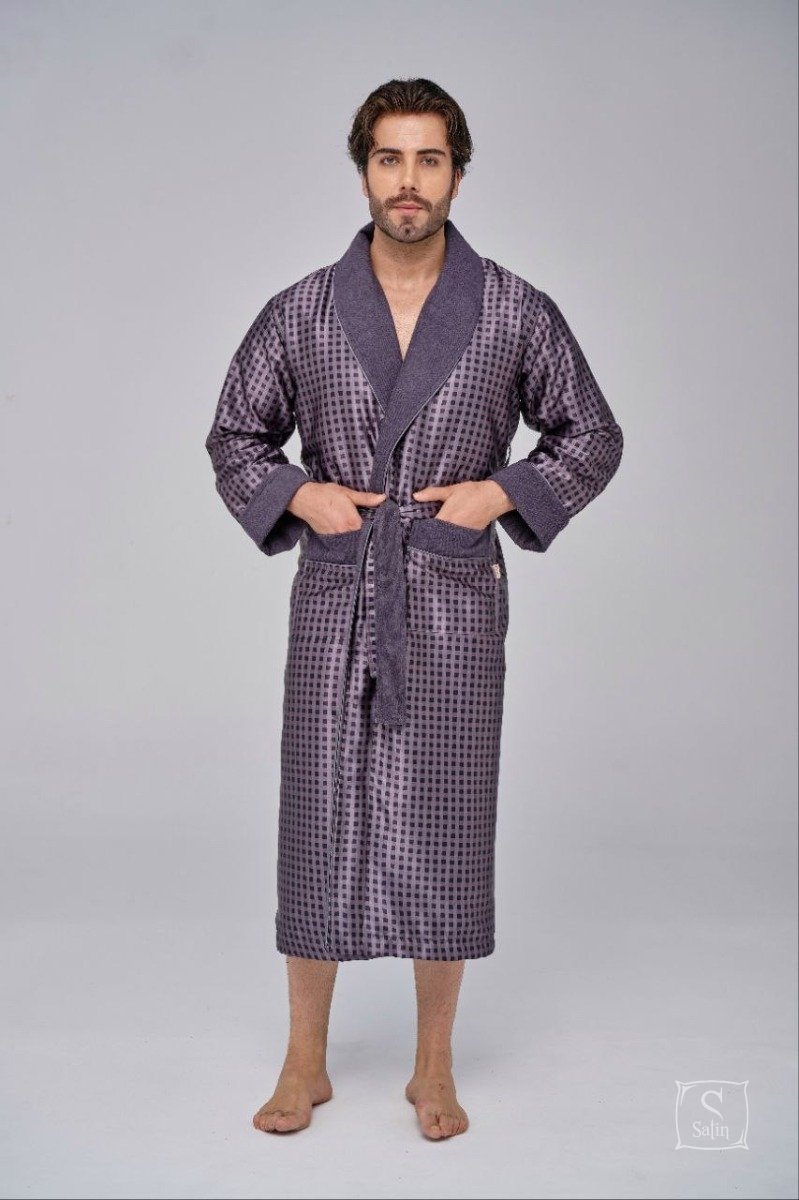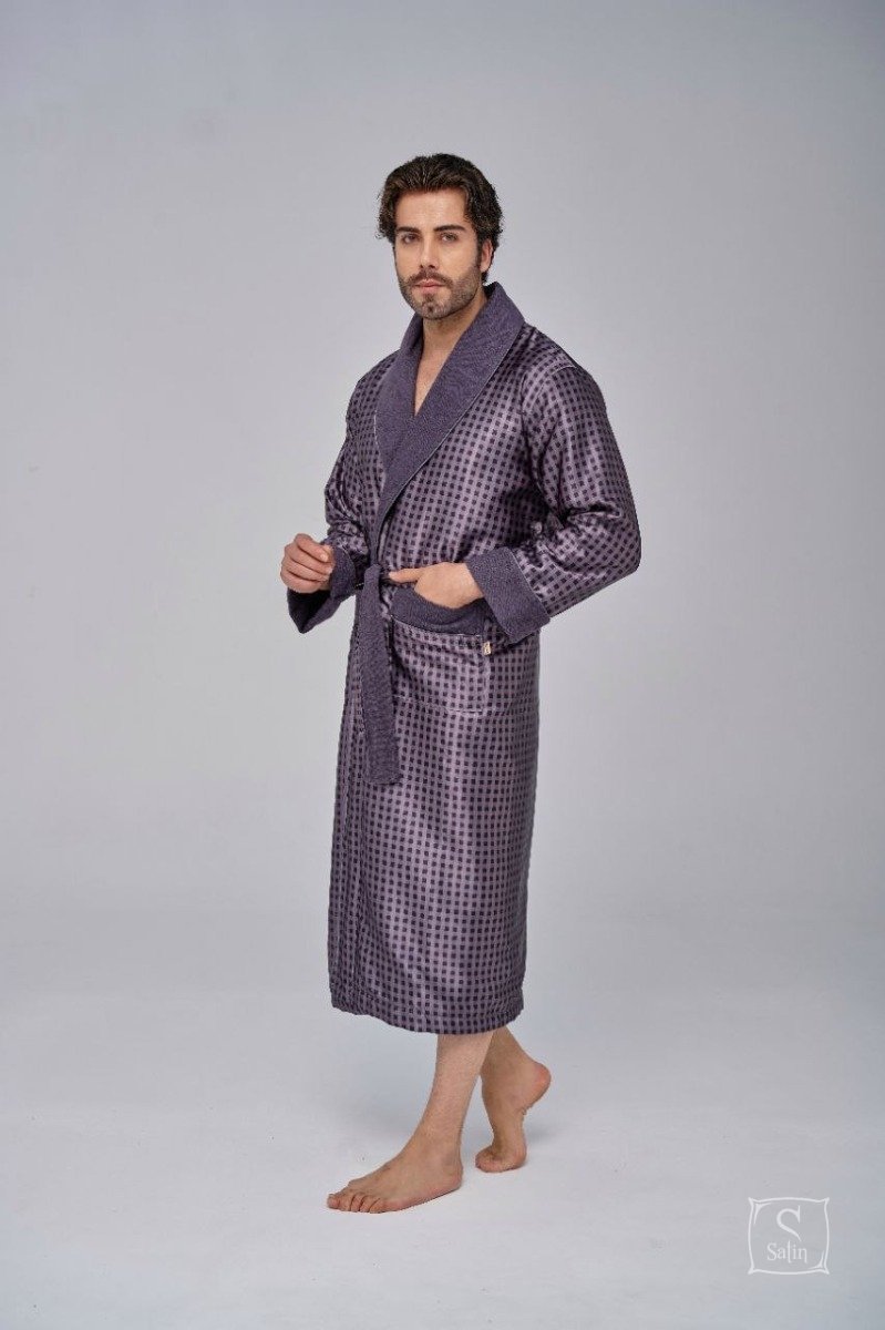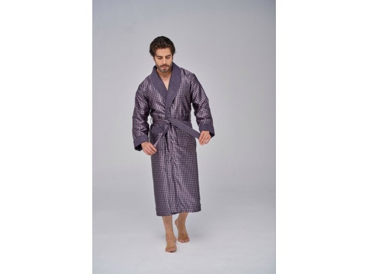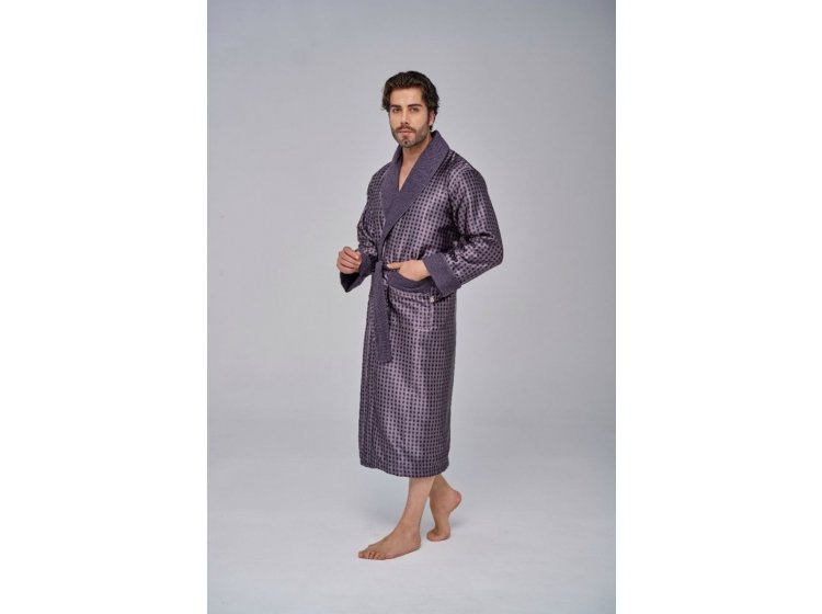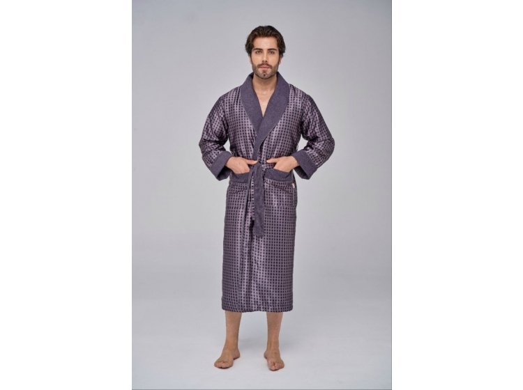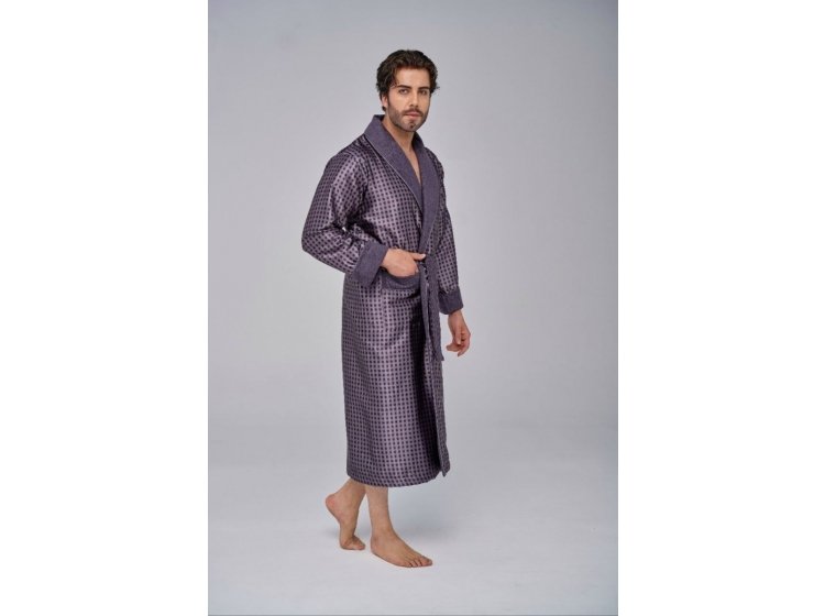 Довгий чоловічий халат "Nusa" ns 1515 сірого кольору із двома кишенями. Відкладний комір і кишені прикрашені кантом . Халат виконаний з тканини зовні: шовк, усередині: махра, підлоги халата утримуються зручним широким поясом. Прекрасний подарунок коханим людям до свят.