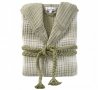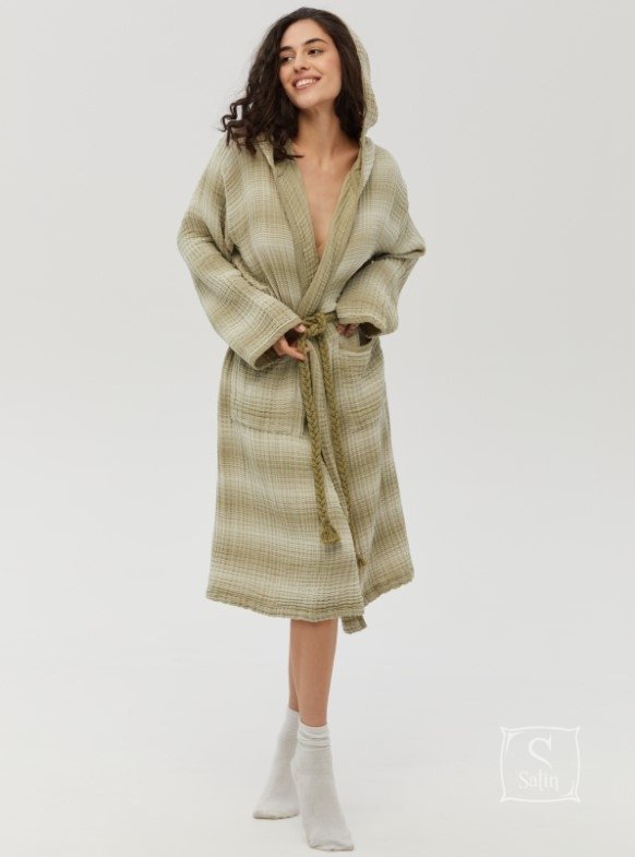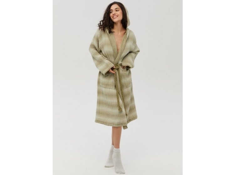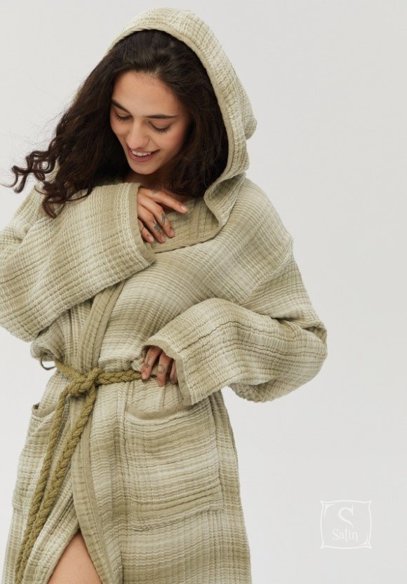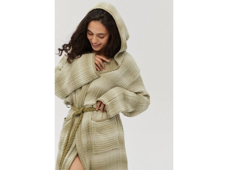 Стильний жіночий мусліновий халат Lotus Home Lilya muslin olive оливкового кольору в смужку, з глибоким капюшоном, кишенями та стильним плетеним поясом. Легка та якісна муслінова тканина з рельєфною текстурою виконана з натуральної бавовни, дарує відчуття затишку та комфорту.