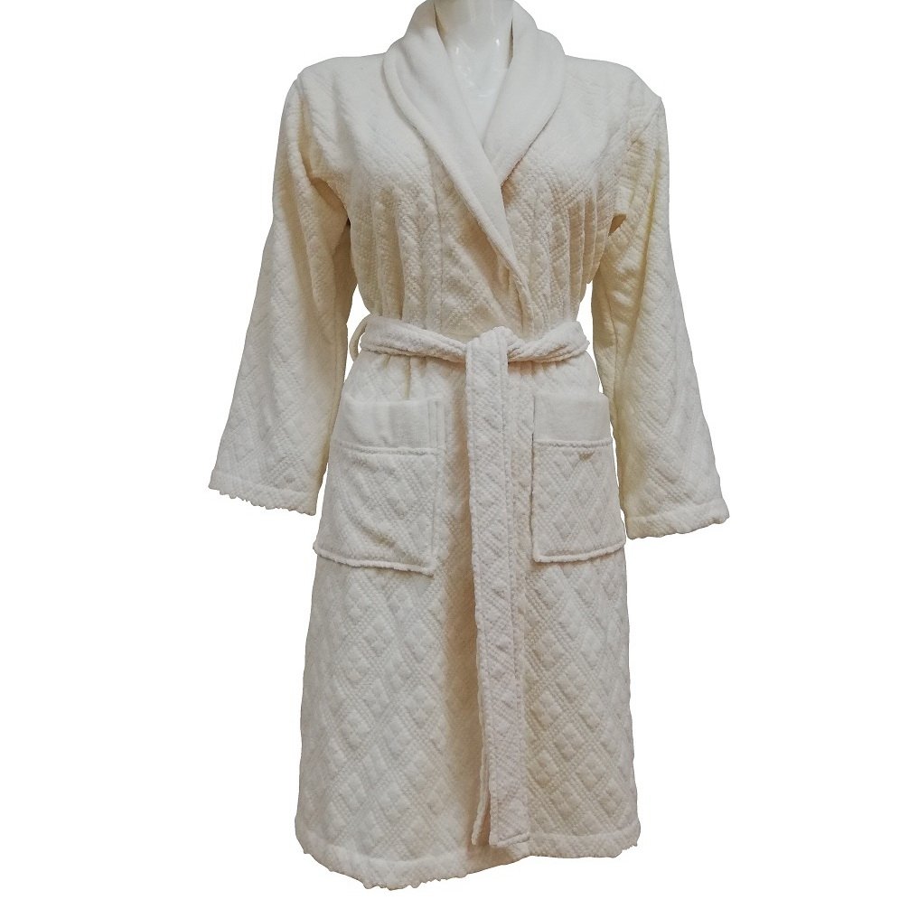Велюровий халат Class Clerica cream кремового кольору з жакардовим візерунком, кишенями та на запах під пояс ідеально підходить для відвідування басейну, пляжу або для використання після лазневих процедур. Халат зі 100% бавовни відмінно вбирає вологу, залишається м'яким після прання.