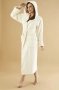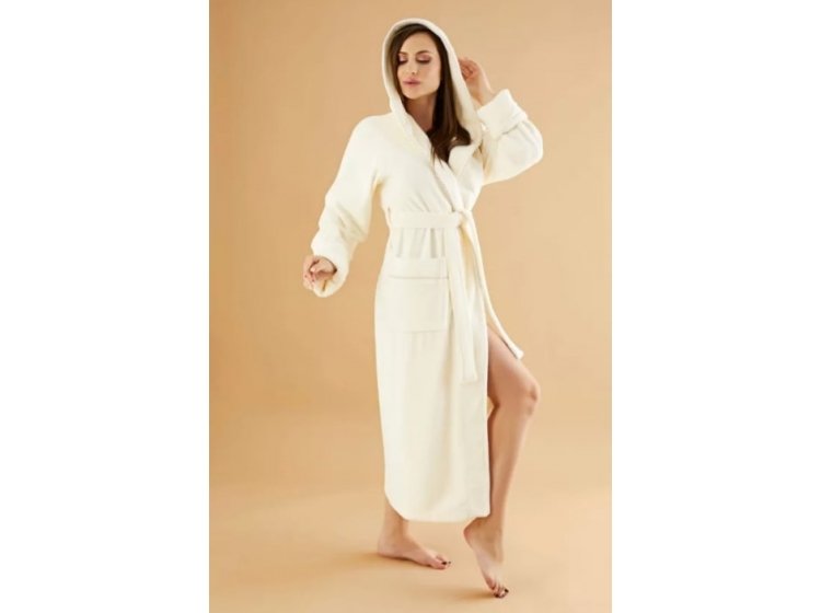 Довгий жіночий махровий бамбуковий халат з капюшоном Nusa 6890 кремового кольору, кишенями, на поясі. Поли та кишені прикрашені кантом.