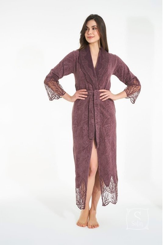 Довгий жіночий халат "Nusa" ns 0497 gul kurusu з тонкого велюру, кольору сухої троянди, з шалевим коміром . Прикрашений мереживом на рукавах, комірі та подолі. Виготовлений у Туреччині.