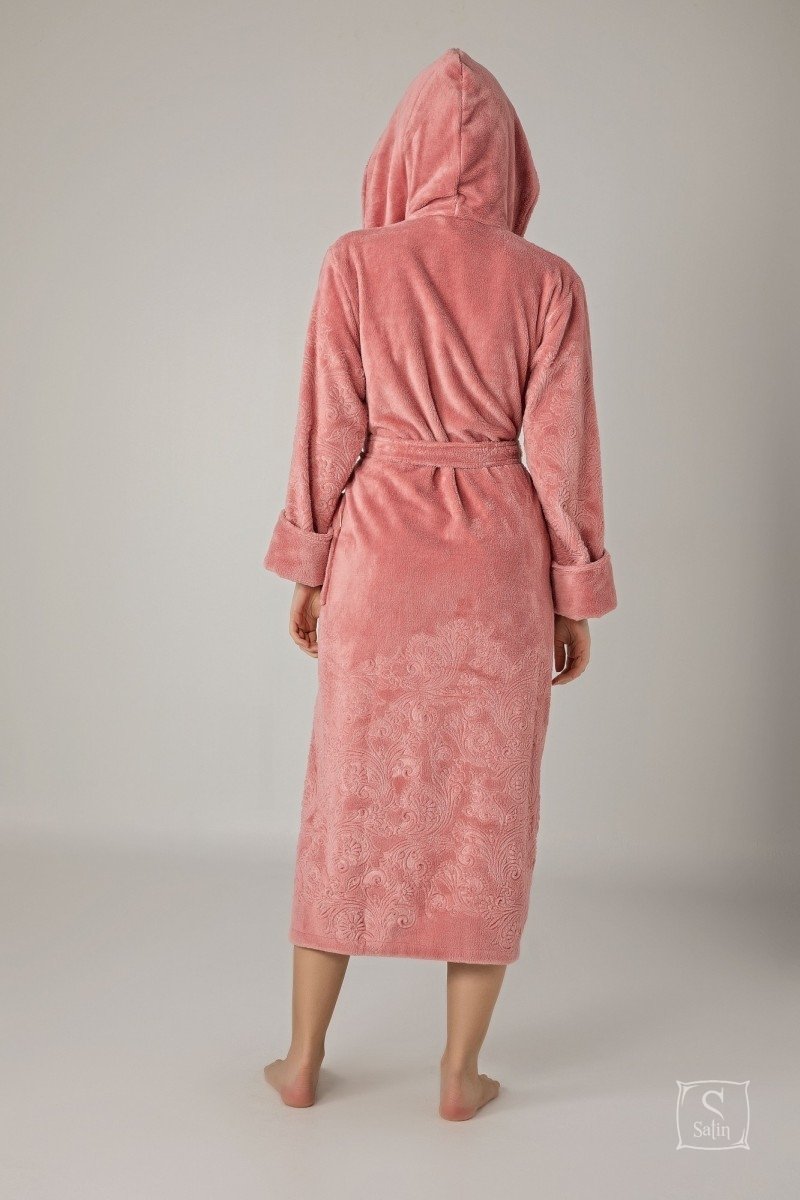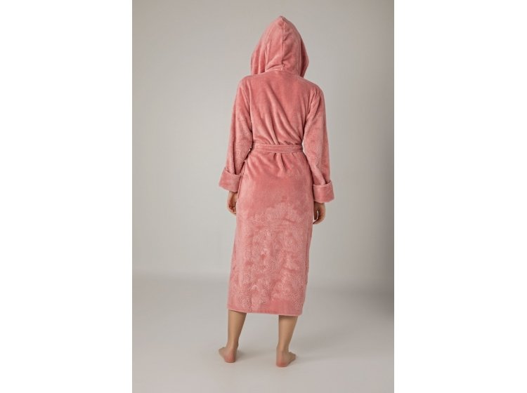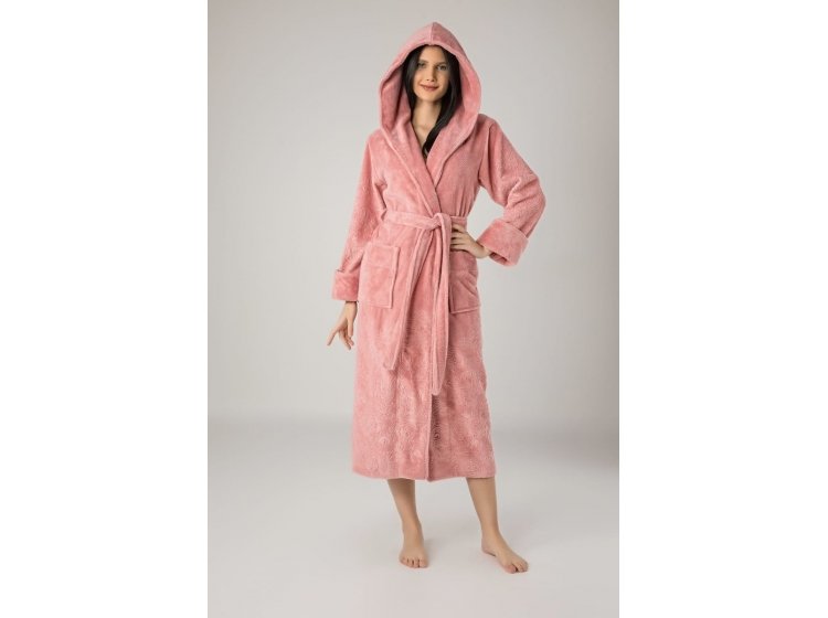 Довгий жіночий халат "Nusa" ns 8655 pudra пудрового кольору з капюшоном . Виготовлений з бамбука, м'який та приємний до тіла. поли халата і рукава прикрашені хитромудрим рельєфним візерунком. Прекрасний подарунок коханим людям до свят.