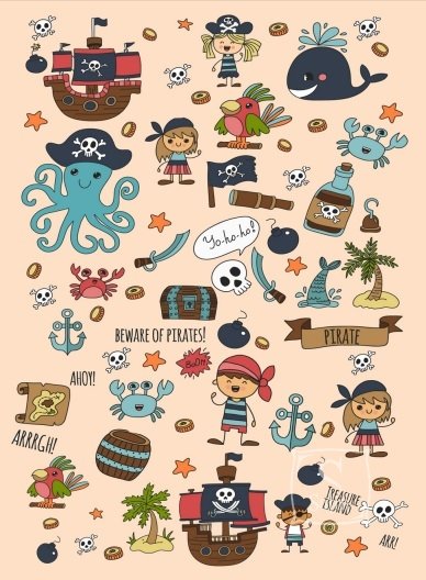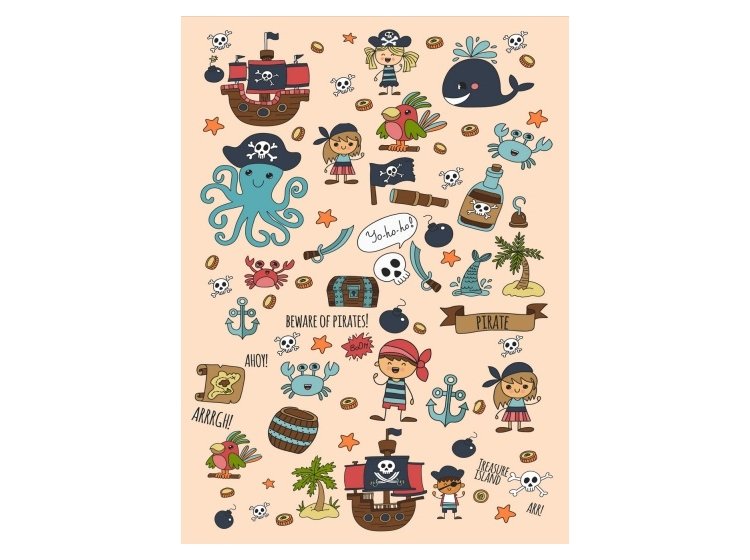 Килимок у дитячу кімнату Chilai Home Pirate оформлений у різнокольорових тонах та прикрашений принтом піратської тематики. Килимок виконаний зі 100% поліестеру, без ворсу, з антиковзким покриттям, товщиною 0,5 см.