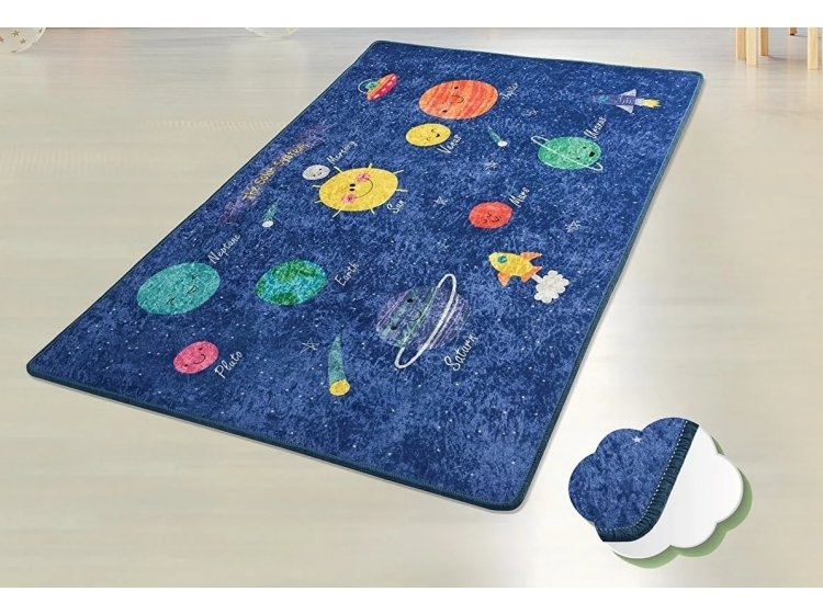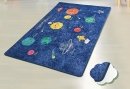 Килимок у дитячу кімнату Chilai Home Space оформлений у синіх тонах та прикрашений принтом планет сонячної системи. Килимок виконаний зі 100% поліестеру, без ворсу, з антиковзким покриттям, товщиною 0,5 см.