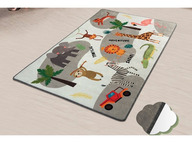 Килимок дитячої кімнати Chilai Home Safari оформлений в біло-сірих тонах і прикрашений принтом африканські тварини. Килимок виконаний зі 100% поліестеру, без ворсу, з антиковзним покриттям, товщиною 0,5 см.