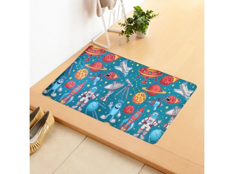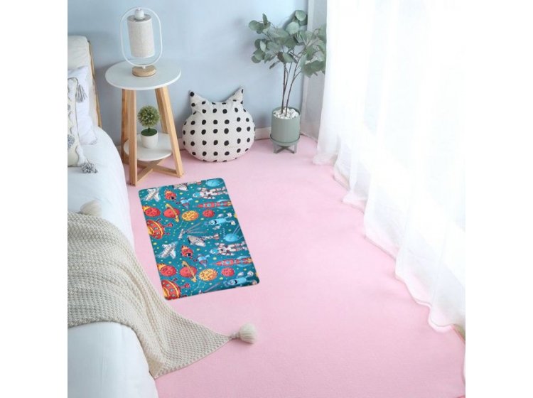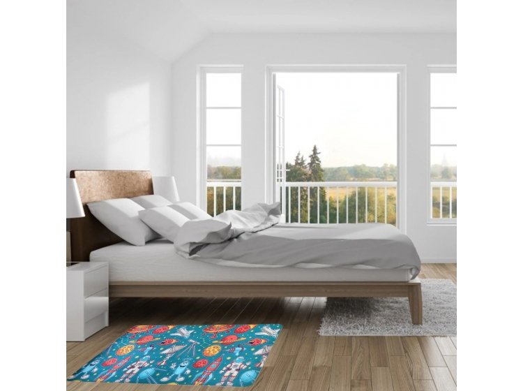 Стильний функціональний килимок для дитячої кімнати IzziHome Kids 2820-09 у синьо-різнокольорових тонах, з принтом космічної тематики, обов'язково сподобається дитині, чудово доповнить інтер'єр, подарує відчуття затишку.