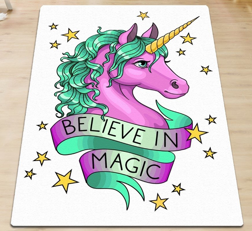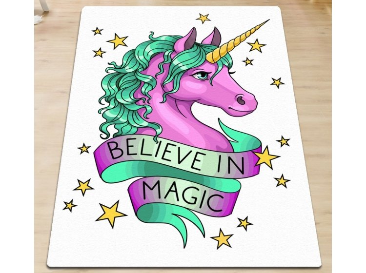 Килимок у дитячу кімнату Chilai Home Believe in magic оформлений у різнокольорових тонах та прикрашений принтом єдинорога. Килимок виконаний зі 100% поліестеру, без ворсу, з антиковзним покриттям, товщиною 0,5 см.
