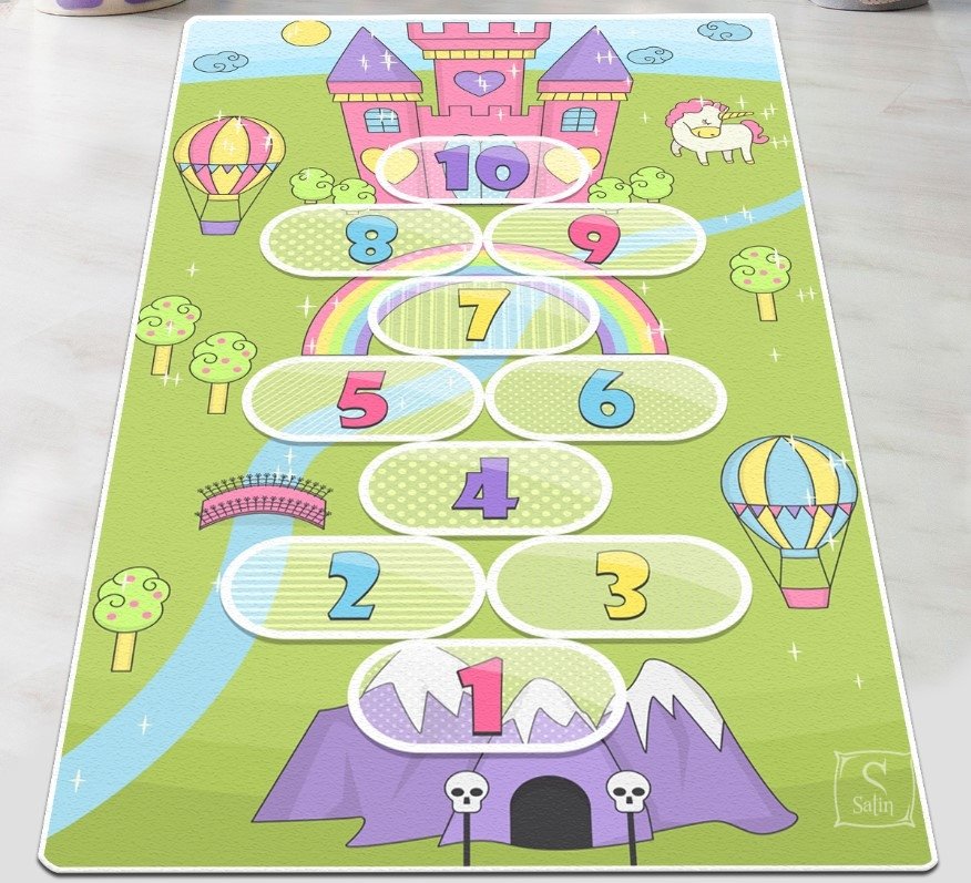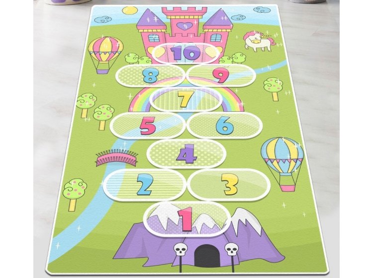 Килимок у дитячу кімнату Chilai Home Castle оформлений у різнокольорових тонах та прикрашений принтом чарівного замку, цифр та єдинорога. Килимок виконаний зі 100% поліестеру, без ворсу, з антиковзким покриттям, товщиною 0,5 см.