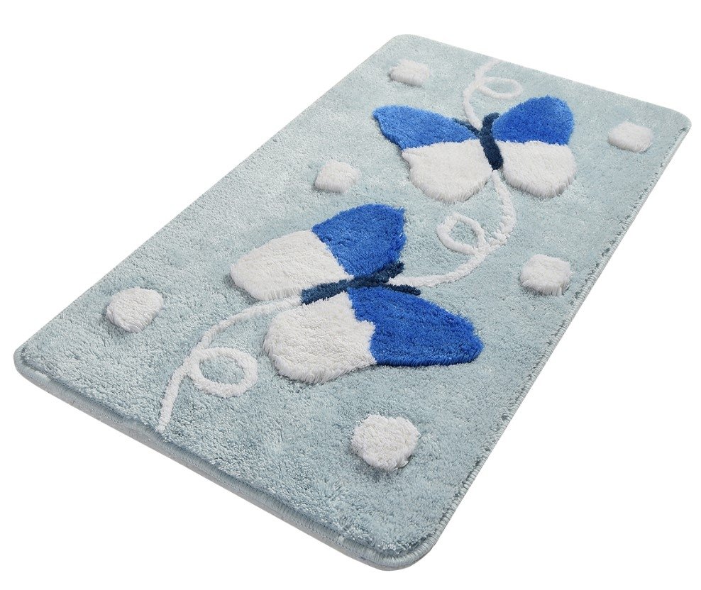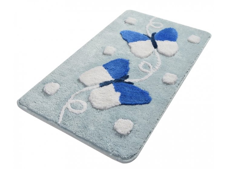 Килимок для ванної кімнати Chilai Home Mari Mavi виконаний у синьо-білих тонах з малюнком метеликів зі 100% акрилу, з антиковзним покриттям завтовшки 1 см.