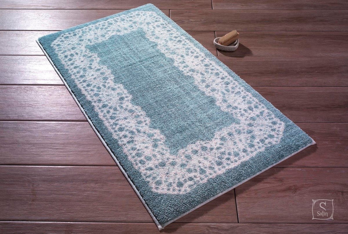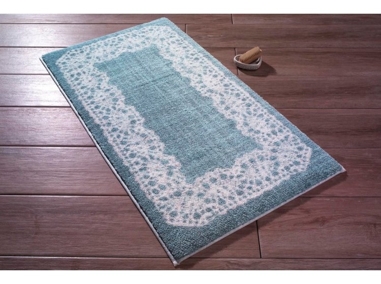 Створення домашнього затишку обов'язково має на увазі покупку красивих і м'яких килимків, які займуть місце у передпокої, спальні або у ванній кімнаті. Ми пропонуємо Вам чудові домашні килимки Confetti . Килимок для ванної Lace Antik Mavi прямокутної форми в синіх тонах з малюнком мереживо , чудово виглядає, довговічний, відмінно стирається.