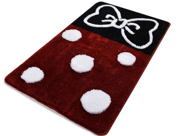 Килимок для ванної Chilai Home Mina Kirmizi темно-бордового кольору з малюнком кружки та бантик, зі 100% акрилу з антиковзним покриттям товщиною 1 см.