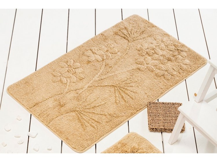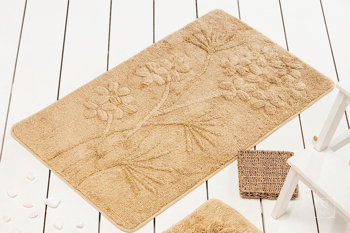 Килимок для ванної кімнати Chilai Home ORKIDE BEIGE темно-бежевого кольору з рослинним малюнком зі 100% акрилу з антиковзким покриттям товщиною 1 см.