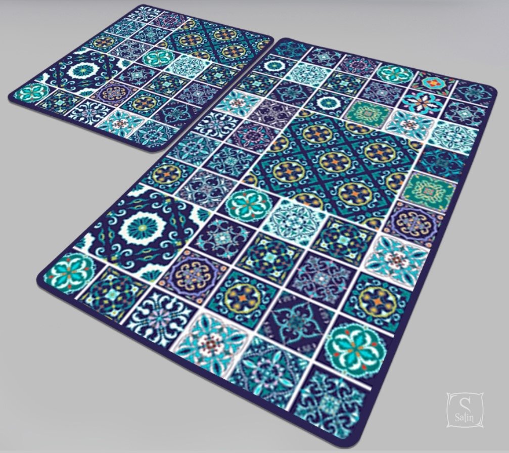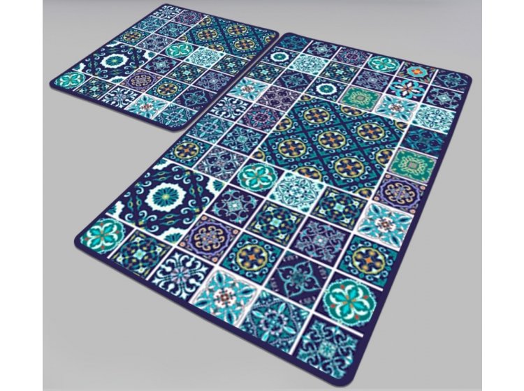Набір килимків для ванної кімнати Chilai Home Carres bleus banyo halisi djt включає два різнокольорові килимки. Килимки Chilai Home виконані без ворсу зі 100% поліестеру , з антиковзним покриттям, товщиною 0,5 см.