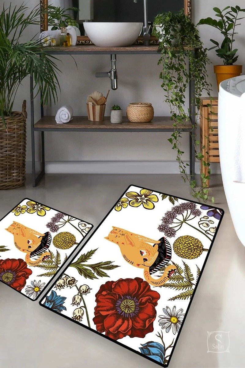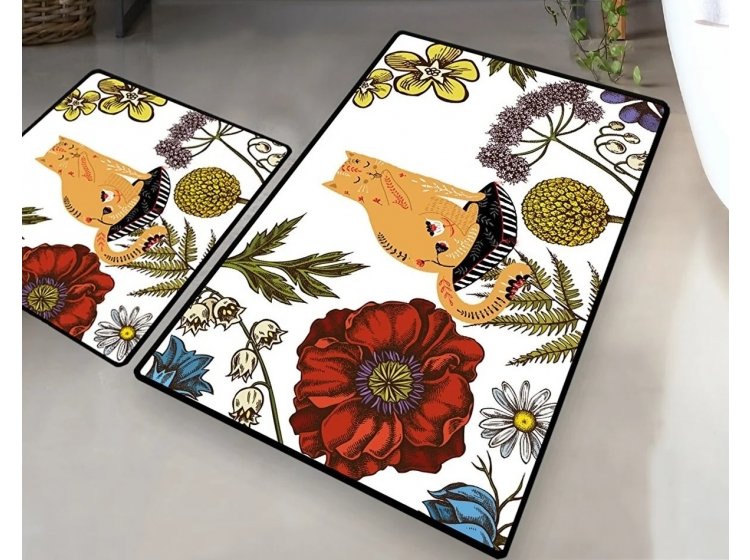 Набір килимків для ванної кімнати Chilai Home Hennaed включає два килимки, виконані в різнокольорових тонах з візерунком кіт і квіти. Килимки Chilai Home виконані без ворсу зі 100% поліестеру , з антиковзним покриттям, товщиною 0,5 см.