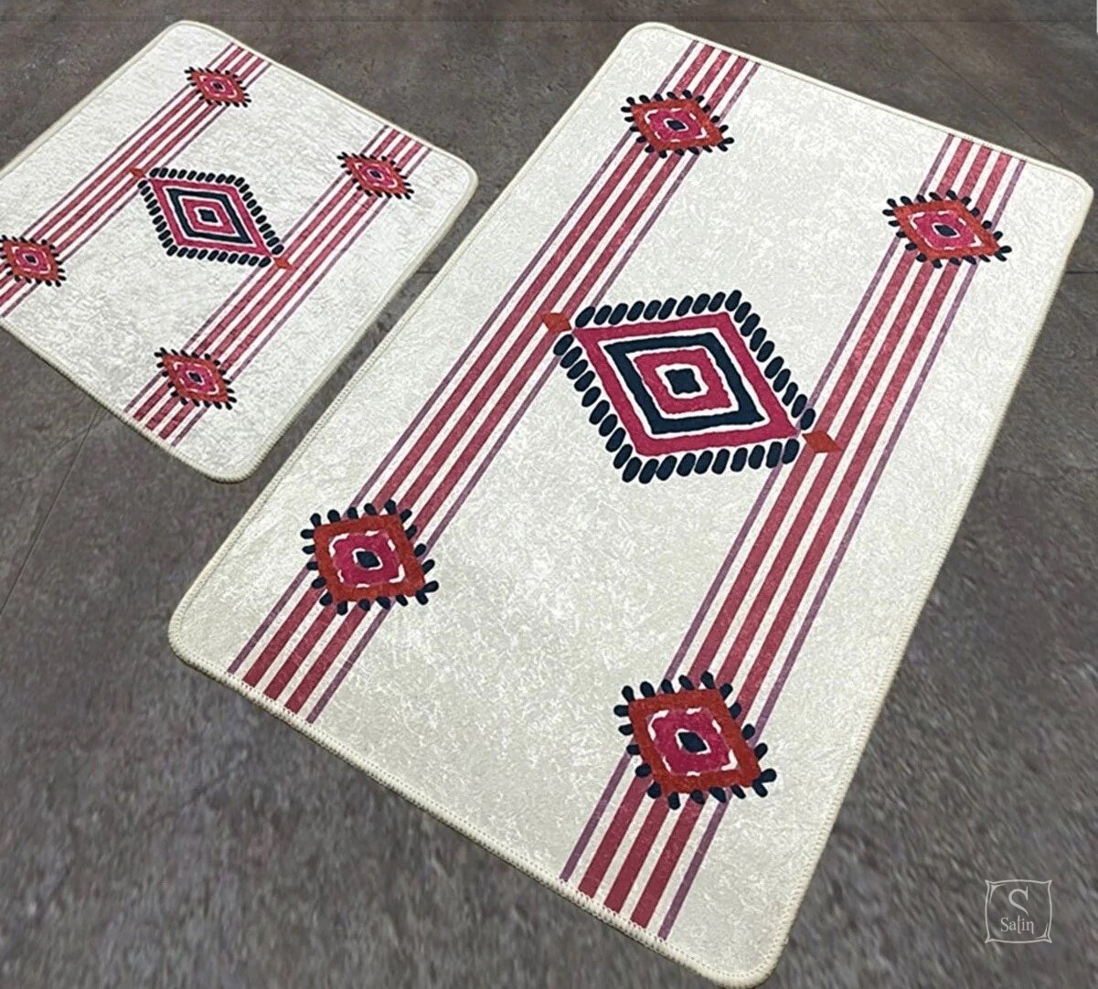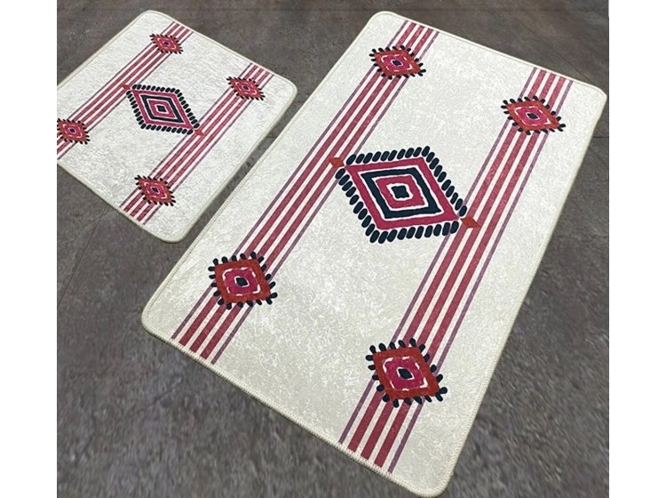 Набір килимків для ванної Chilai Home Meore включає два килимки виконаних в сіро-червоно-чорних тонах з візерунком геометрія. Килимки Chilai Home виконані без ворсу зі 100% поліестеру , з антиковзним покриттям, товщиною 0,5 см.