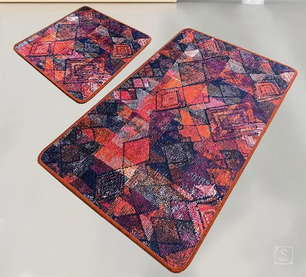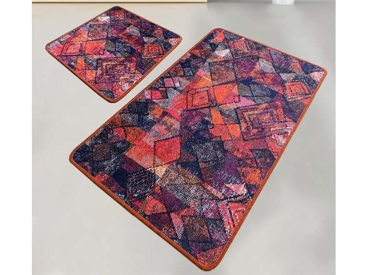Набір килимків для ванної Chilai Home Monica включає два килимки виконаних у різнокольорових тонах з візерунком геометрія. Килимки Chilai Home виконані без ворсу зі 100% поліестеру , з антиковзним покриттям, товщиною 0,5 см.