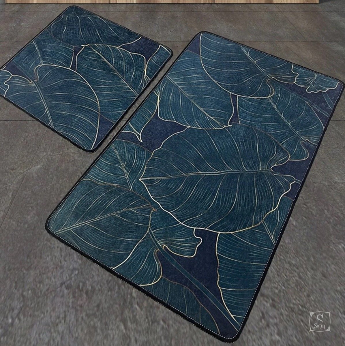 Набір килимків для ванної кімнати Chilai Home Zeleno включає два килимки виконані в синіх тонах з візерунком листя. Килимки Chilai Home виконані без ворсу зі 100% поліестеру , з антиковзним покриттям, товщиною 0,5 см.
