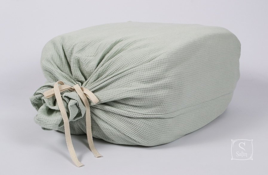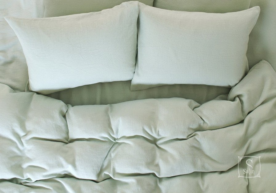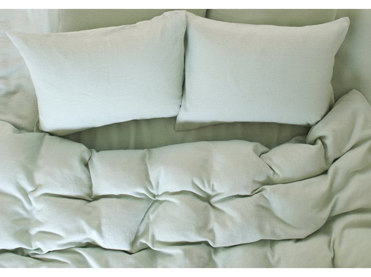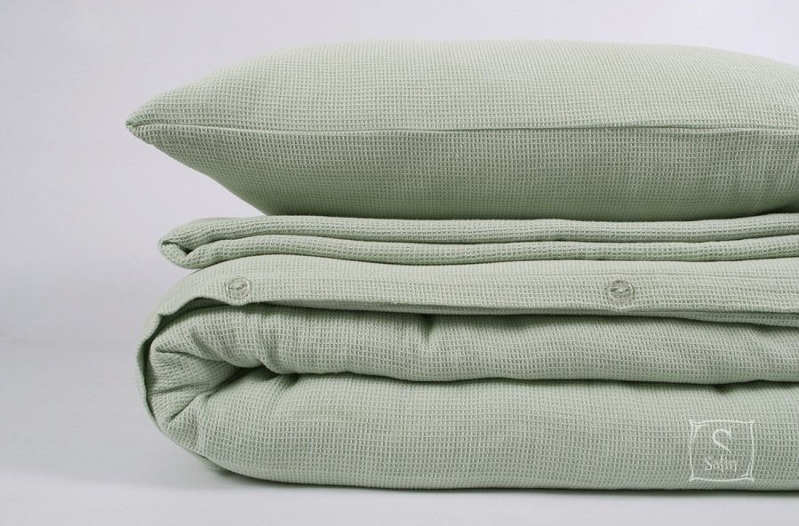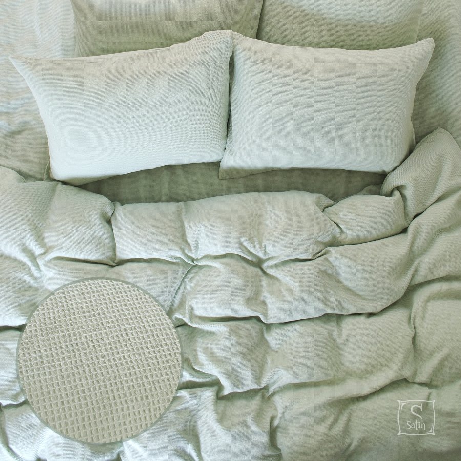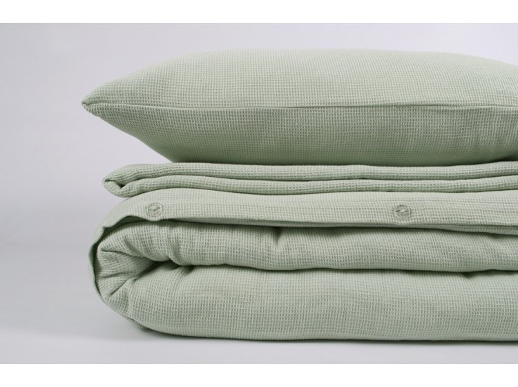 • Комплект Waffle sage однотонного   ментолового кольору виготовлений з вафельного полотна (100% бавовна) призначений спеціально для спекотних літніх ночей , упакований у чохол на зав'язках.
