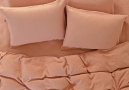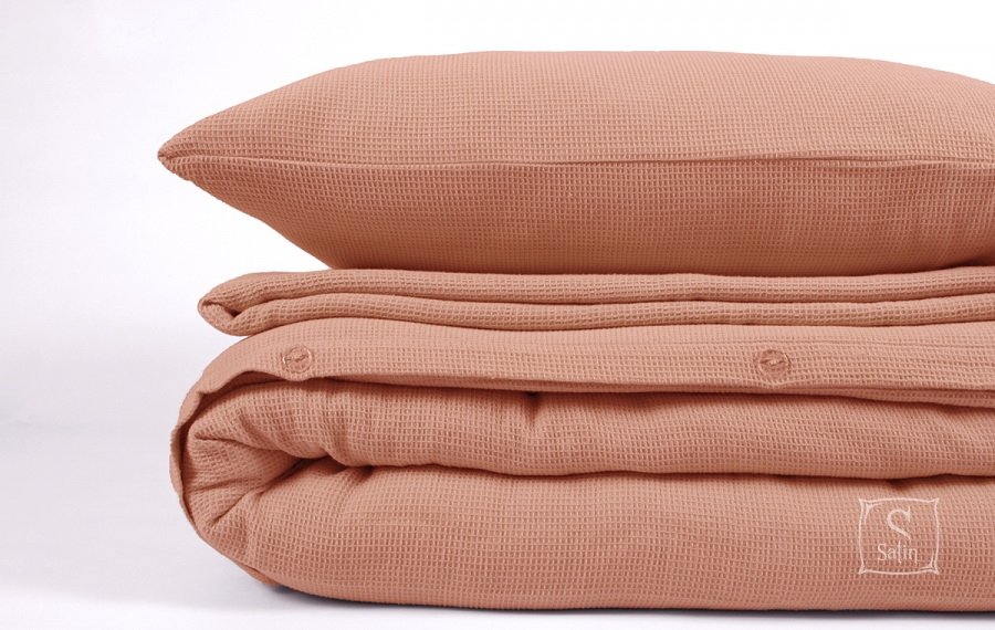 • Комплект Waffle shrimp однотонного   персикового кольору виготовлений з вафельного полотна (100% бавовна) призначений спеціально для спекотних літніх ночей , упакований у чохол на зав'язках.