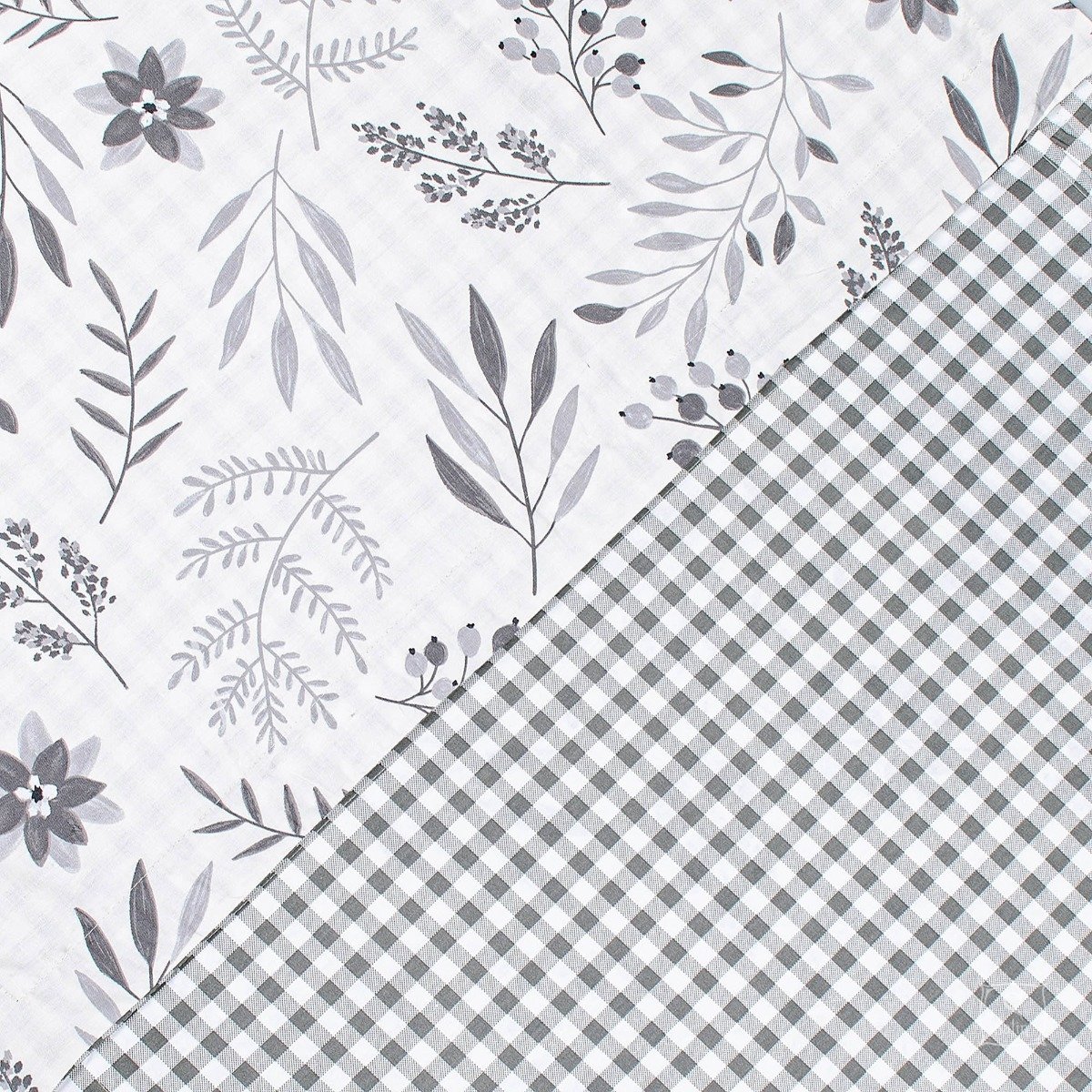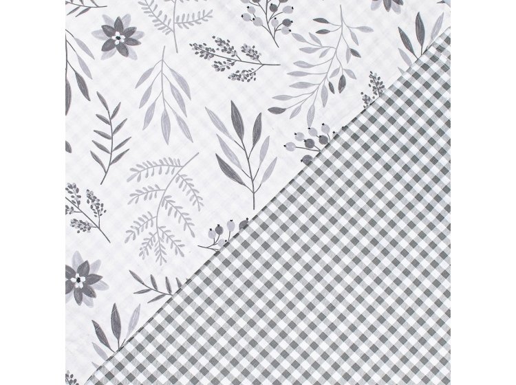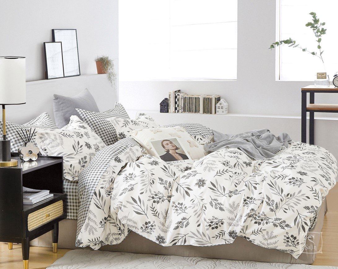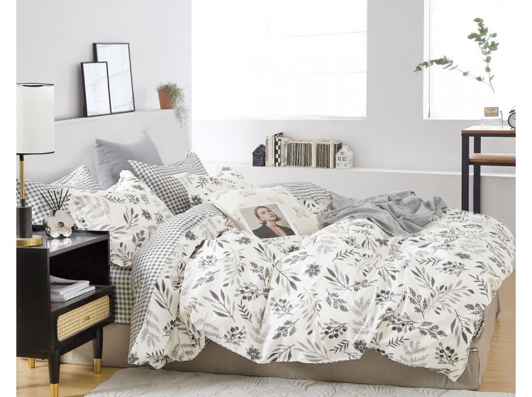 Комплект Home Line Сатин "Світанок" виконаний у сіро-білих тонах із візерунком листя, квіти та клітина.