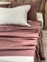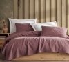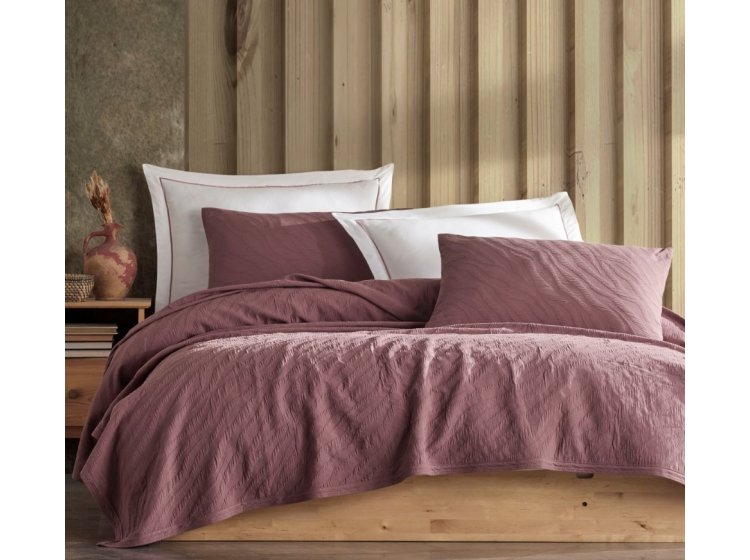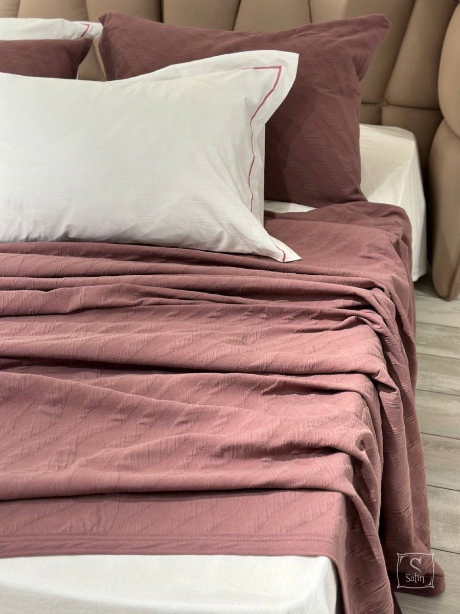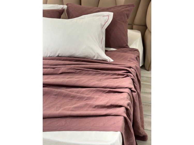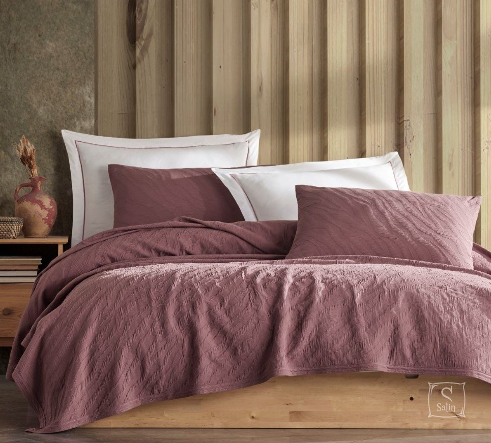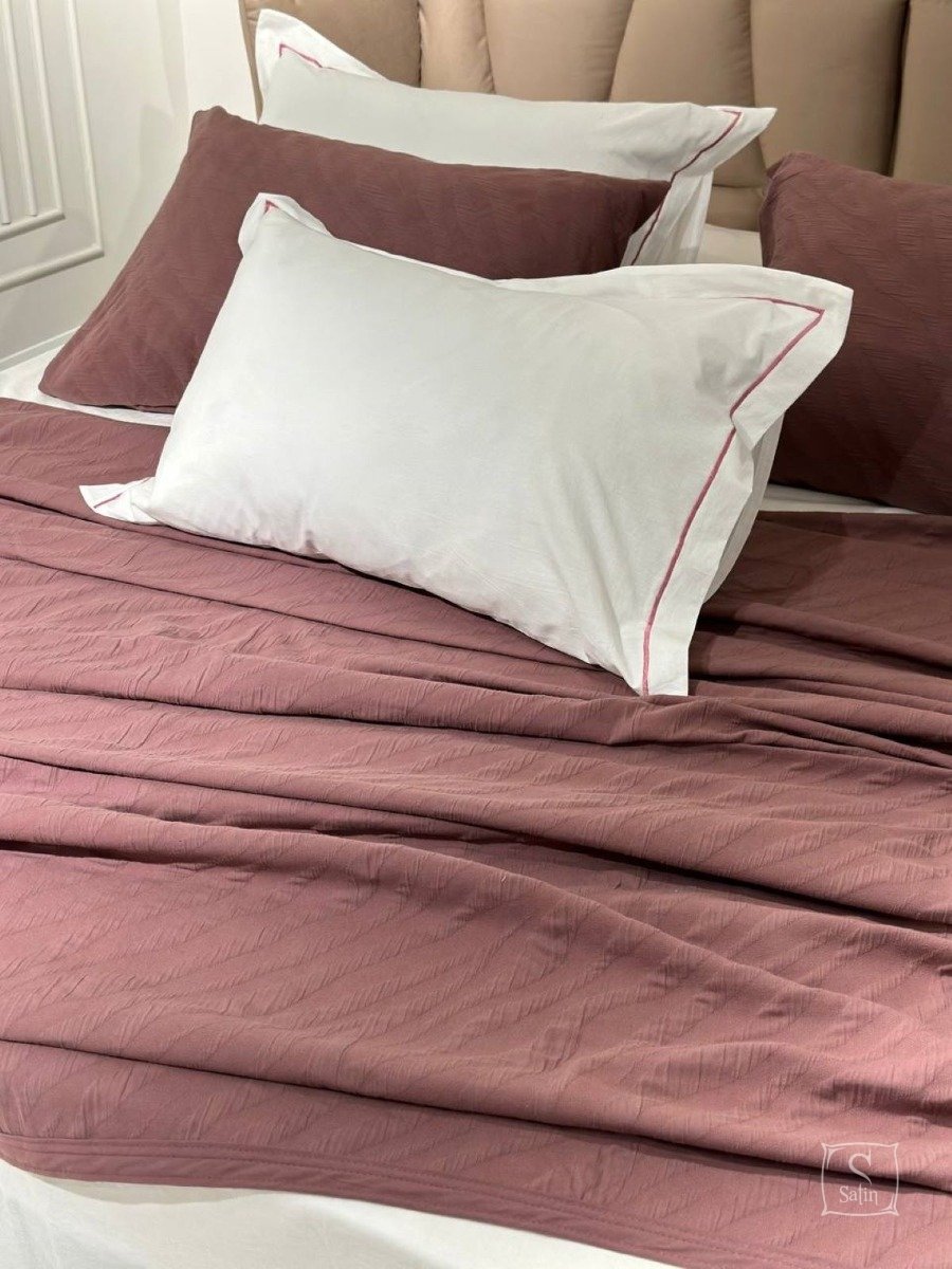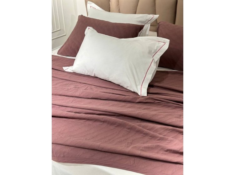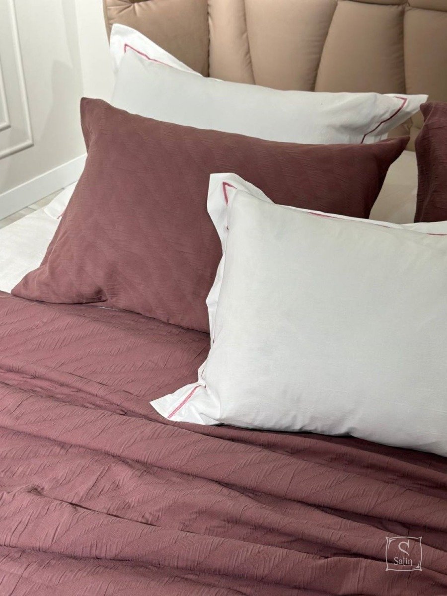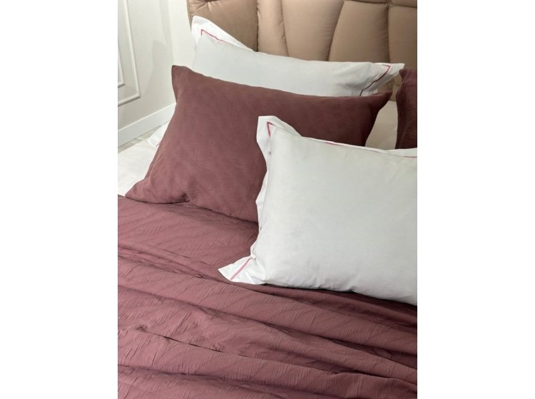 Комплект літньої постільної білизни з покривалом Saheser Zebra murdum виготовлений із 100% натуральної бавовни, декорований жаккардовим візерунком на покривалі та двох наволочках, у вишневому кольорі, однотонна постільна білизна світла з обідком вишневого кольору.