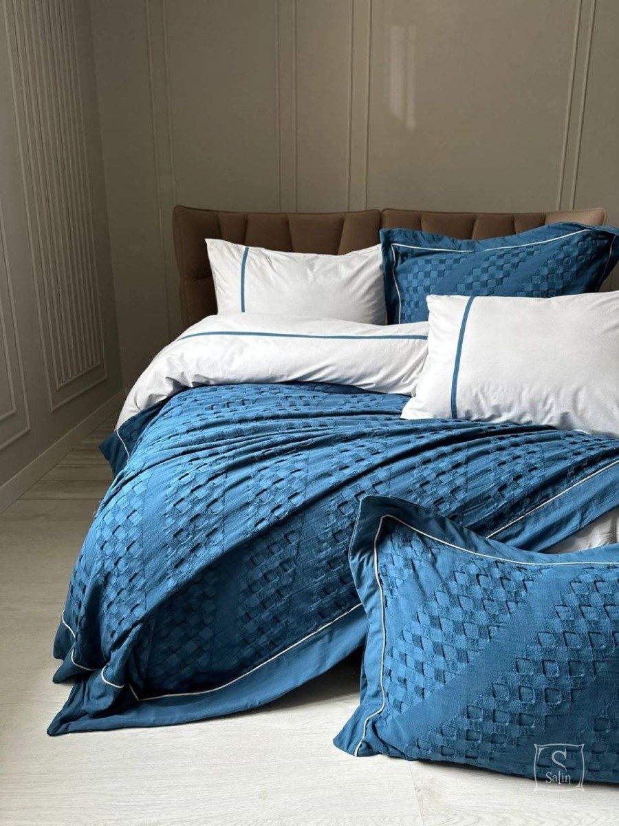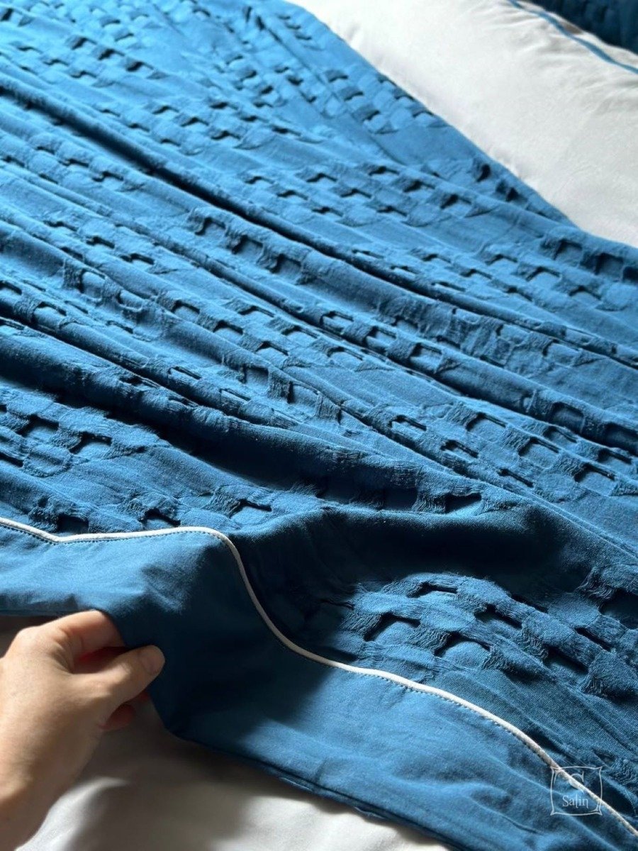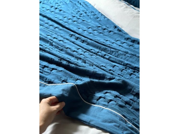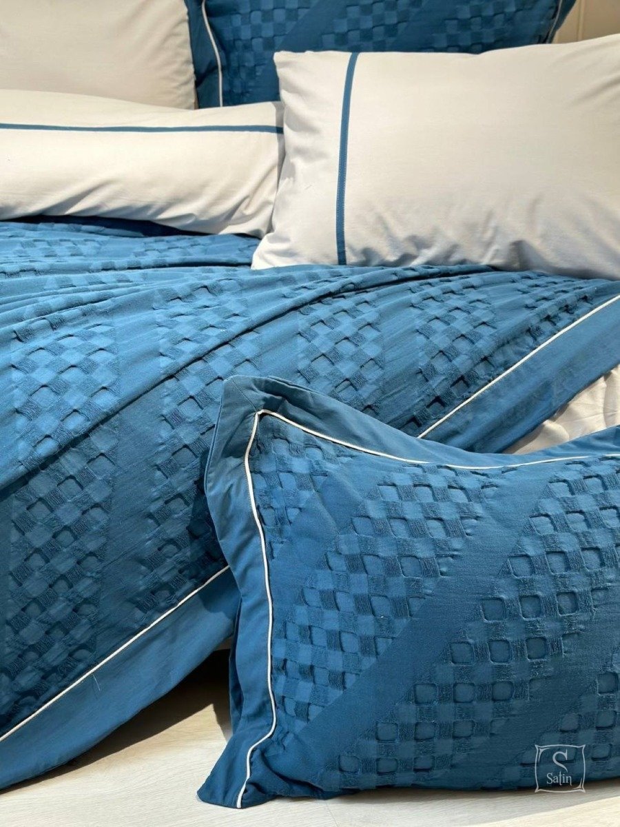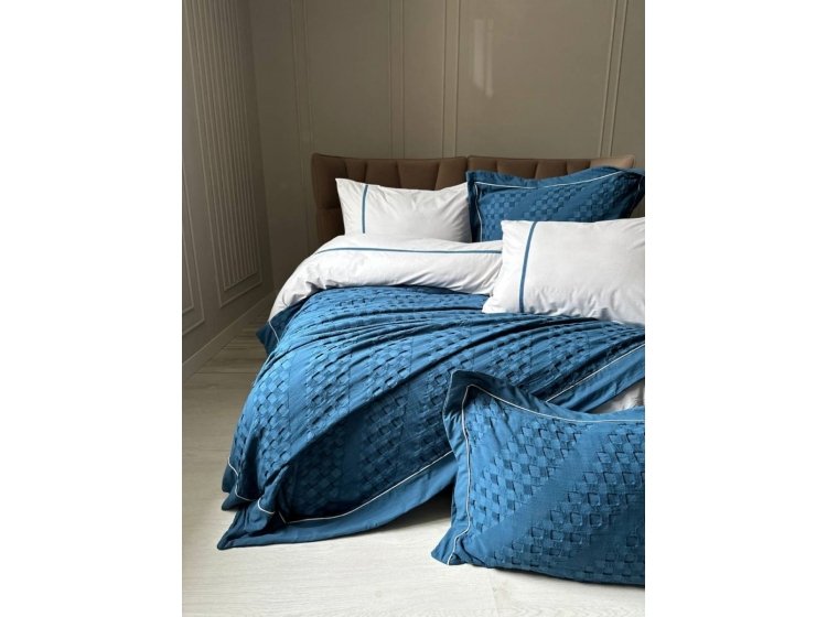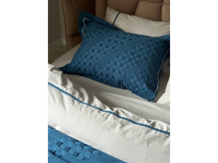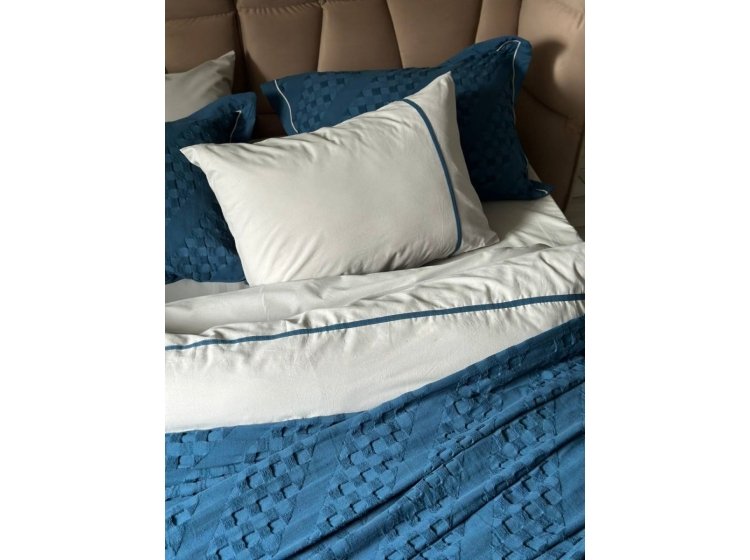 Комплект постільної білизни з легким піком Saheser Helen blue виготовлений із 100% натуральної бавовни, декорований кантом блакитного кольору на підковдрах і двох наволочках, білого кольору, піке та дві наволочки у блакитному кольорі з кантом та візерунком.