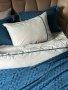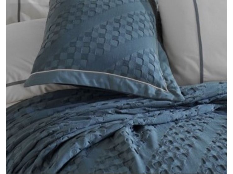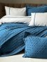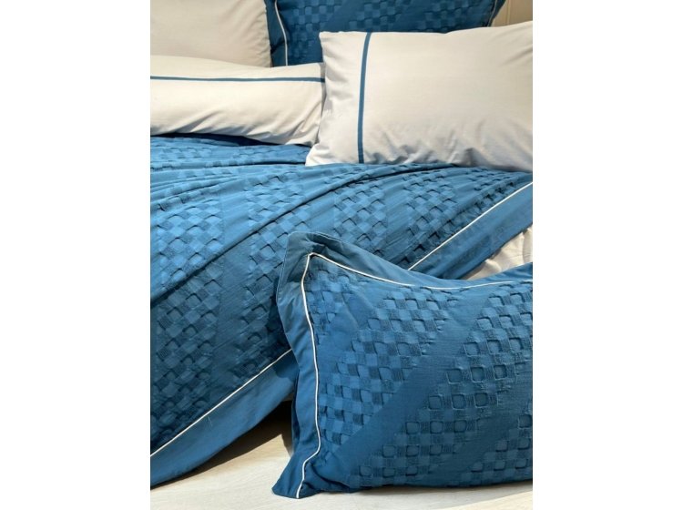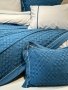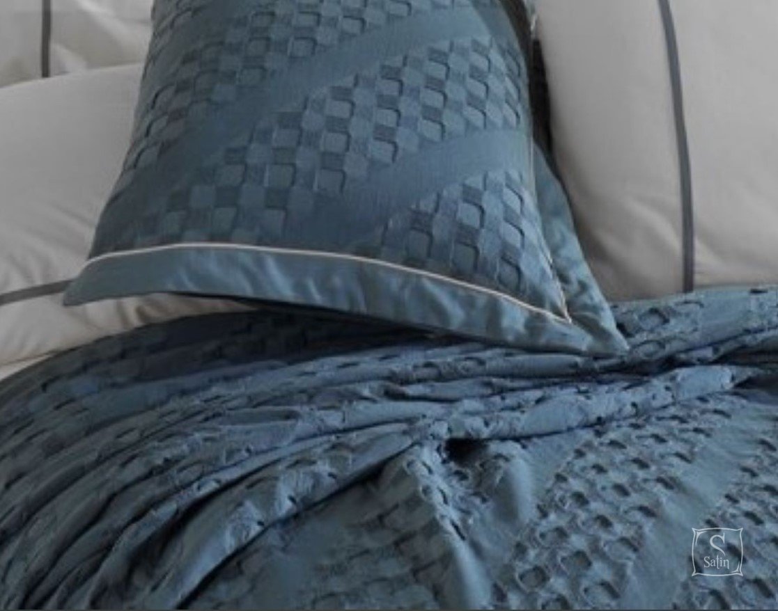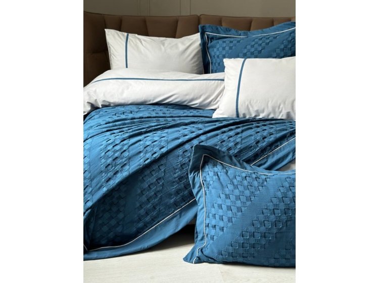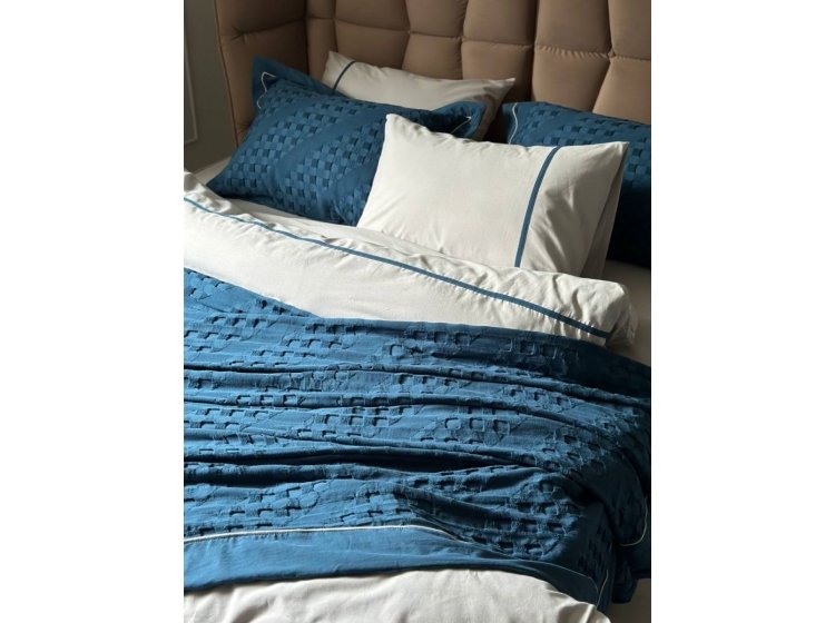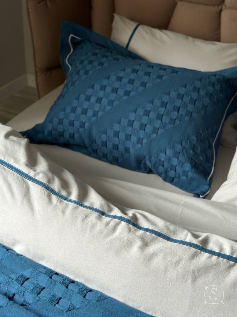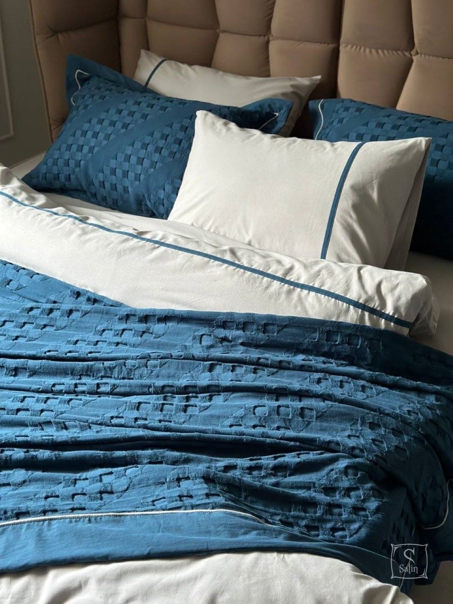 Комплект постільної білизни з легким піком Saheser Helen blue виготовлений із 100% натуральної бавовни, декорований кантом блакитного кольору на підковдрах і двох наволочках, білого кольору, піке та дві наволочки у блакитному кольорі з кантом та візерунком.