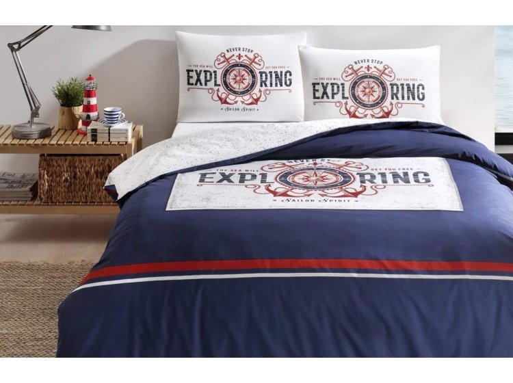 • Комплект постільної білизни Greedo виконаний у біло-синіх тонах із малюнком на морську тематику із натурального бавовняного ранфорсу.