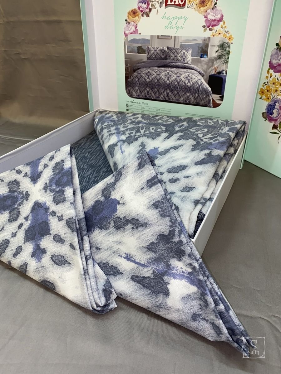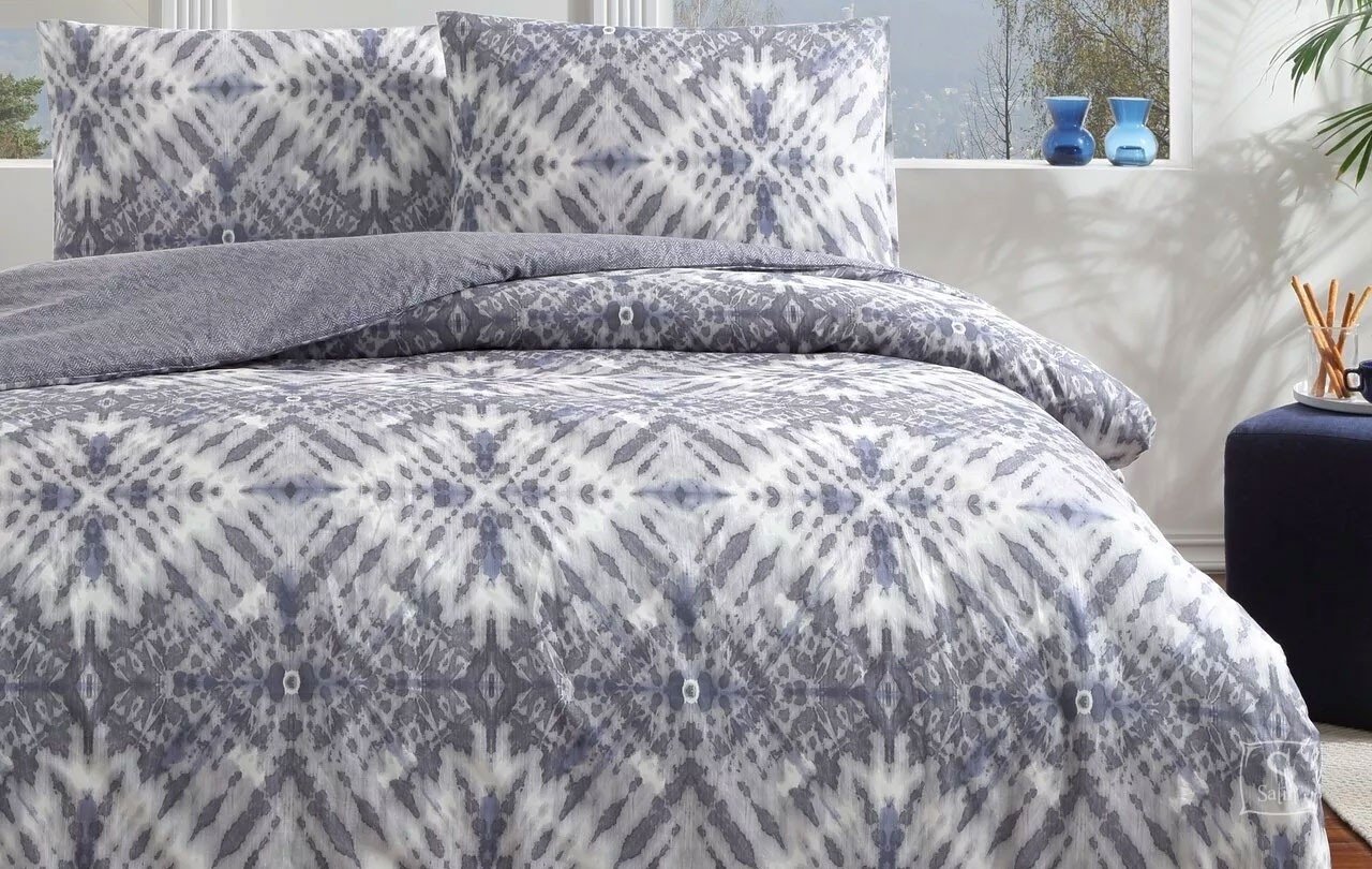 Комплект постільної білизни Mavis виконаний у сіро-синіх тонах із малюнком геометрія із натурального бавовняного ранфорсу.