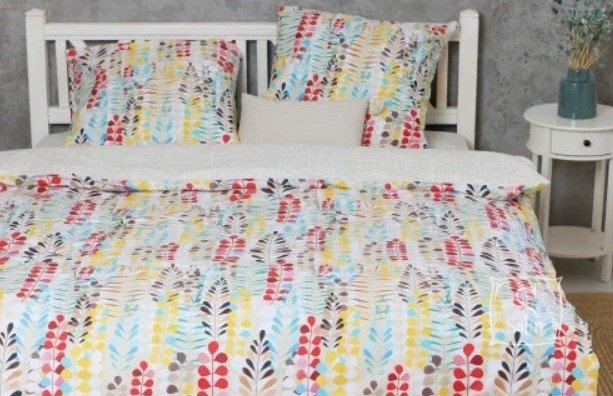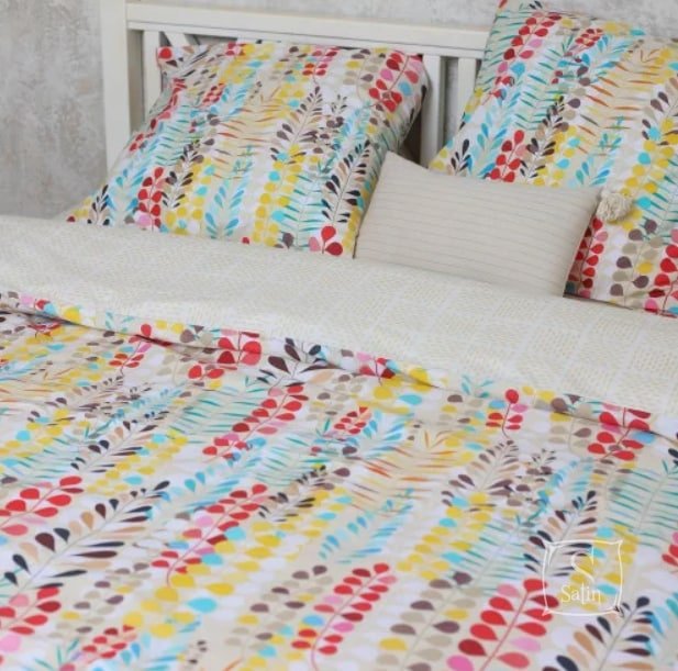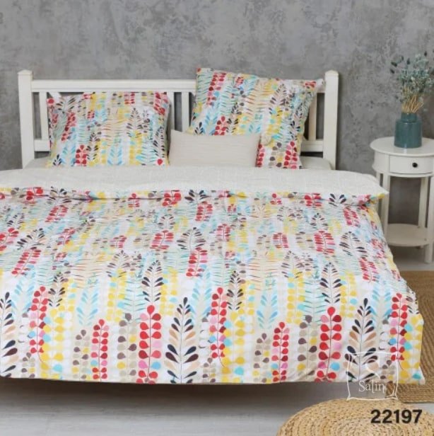 Постільна білизна Viluta з ранфорсу.Модель 22197 з малюнком різнокольорового листя і світло-бежевим простирадлом.
