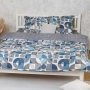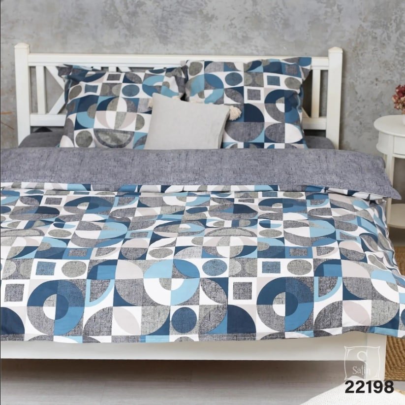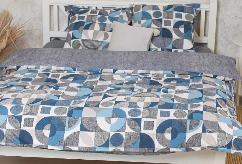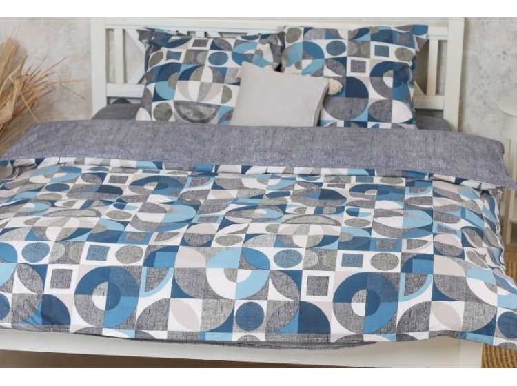 Постільна білизна Viluta з ранфорсу.Модель 22198 з синьо-сірим геометричним малюнком у стилі ф'южн і темно-сірим контрастним простирадлом.