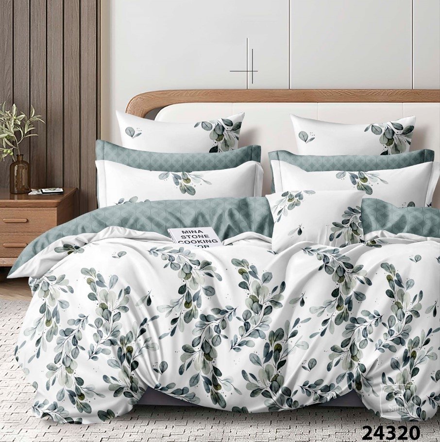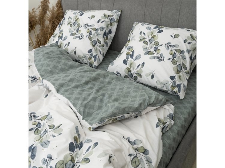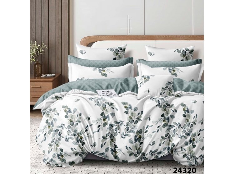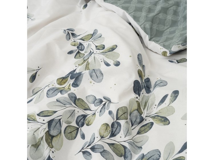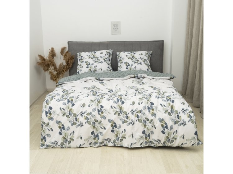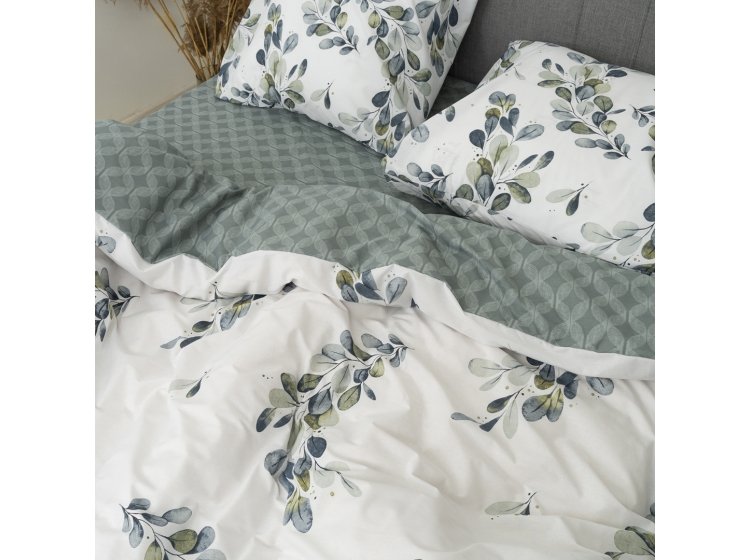 Постільна білизна Viluta із ранфорсу. Модель 24320 виконана в біло-зелених тонах із принтом гілочок із листям.