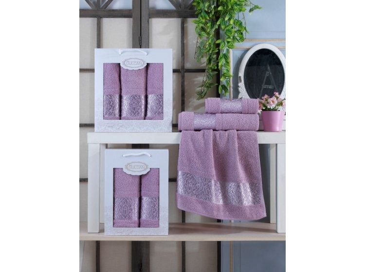 Шикарний набір м'яких махрових рушників Gulcan Cotton Frower Ornament Leylak зі 100% бавовни бузкового кольору. Рушники оздоблені вишивкою у вигляді квіткового орнаменту на жакардовому бордюрі. Рушники високої густини (480 г/м2), з пухнастим ворсом. Вироблено у Туреччині.