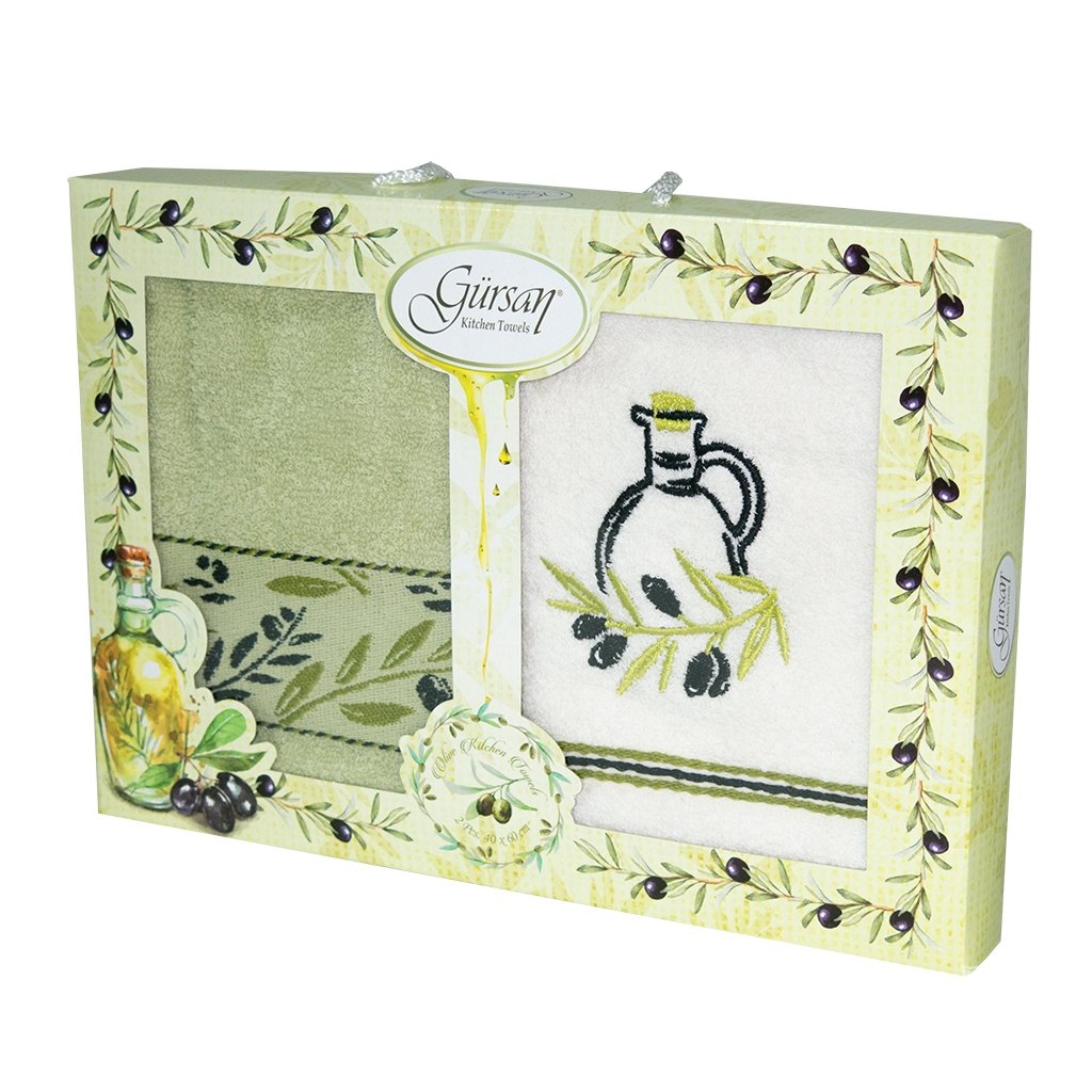 Шикарний набір м'яких махрових рушників Gursan Оливка 01 двох кольорів з бавовни оздоблено вишивкою оливкових гілок. Рушники високої щільності (480 г/м2), з пухнастим ворсом. У набір входить два рушники розмірами: 40х60 см.