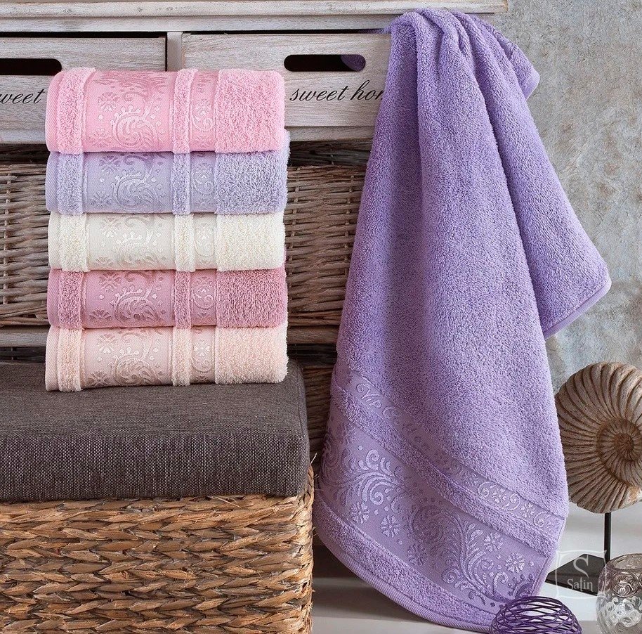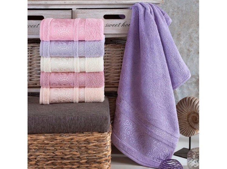 Набір махрових рушників Cestepe VIP Cotton Alina складається з шести різнокольорових рушників з однаковим візерунком. Рушники виконані з жаккардової двосторонньої махри (10 бавовна), з бордюром.
