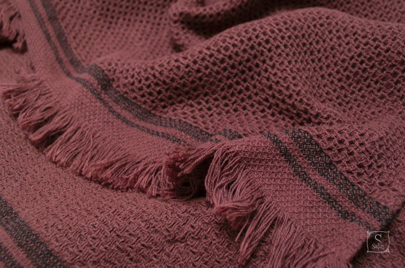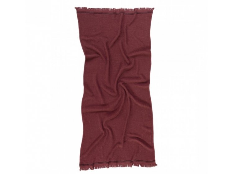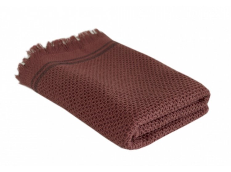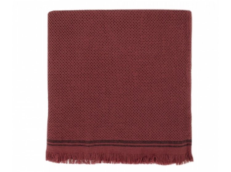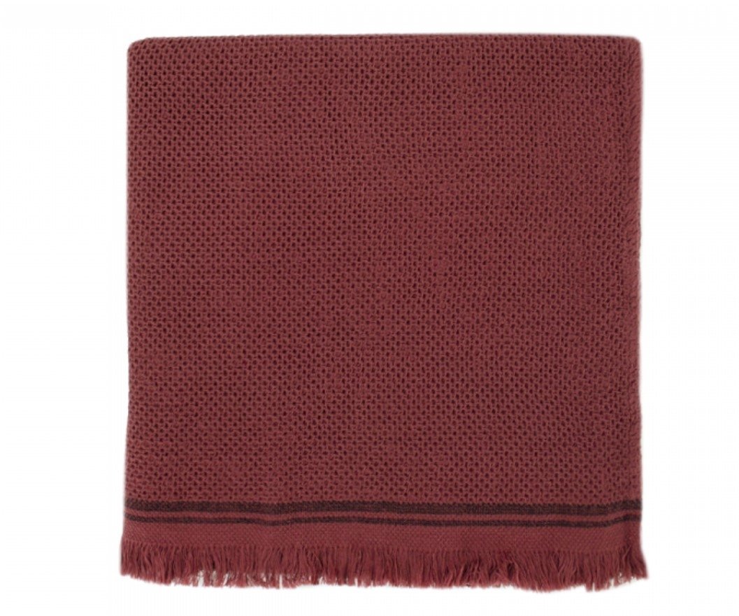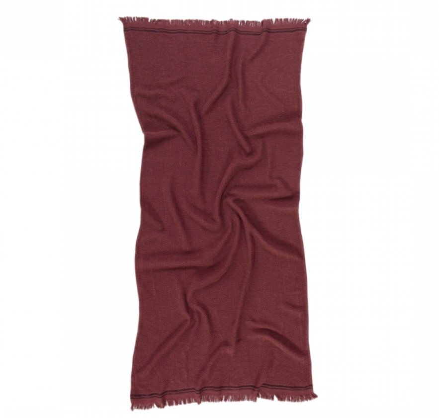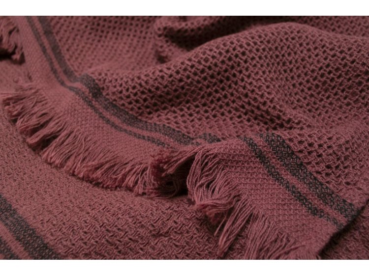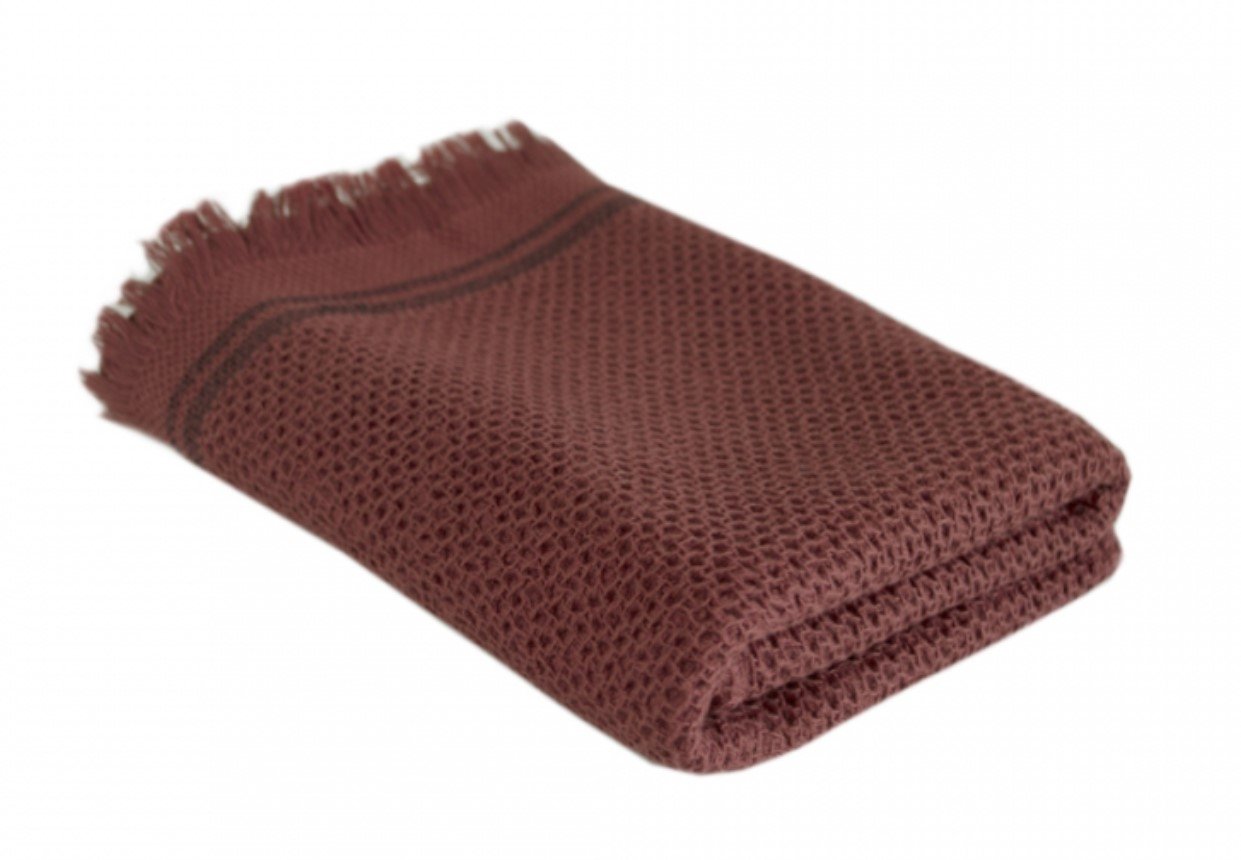 Махровий рушник Parga burnt bordo бордового кольору з рельєфним візерунком і бахромою , виготовлений з натуральної вафельної махри , що має необхідні якості для щоденного комфортного використання.