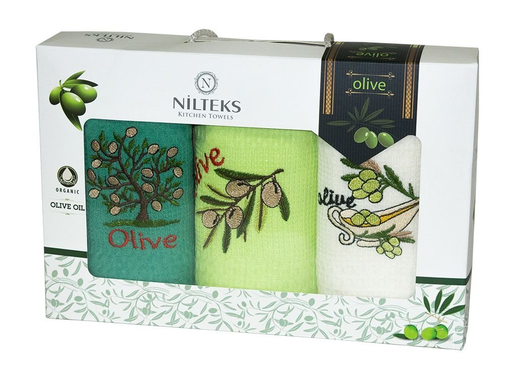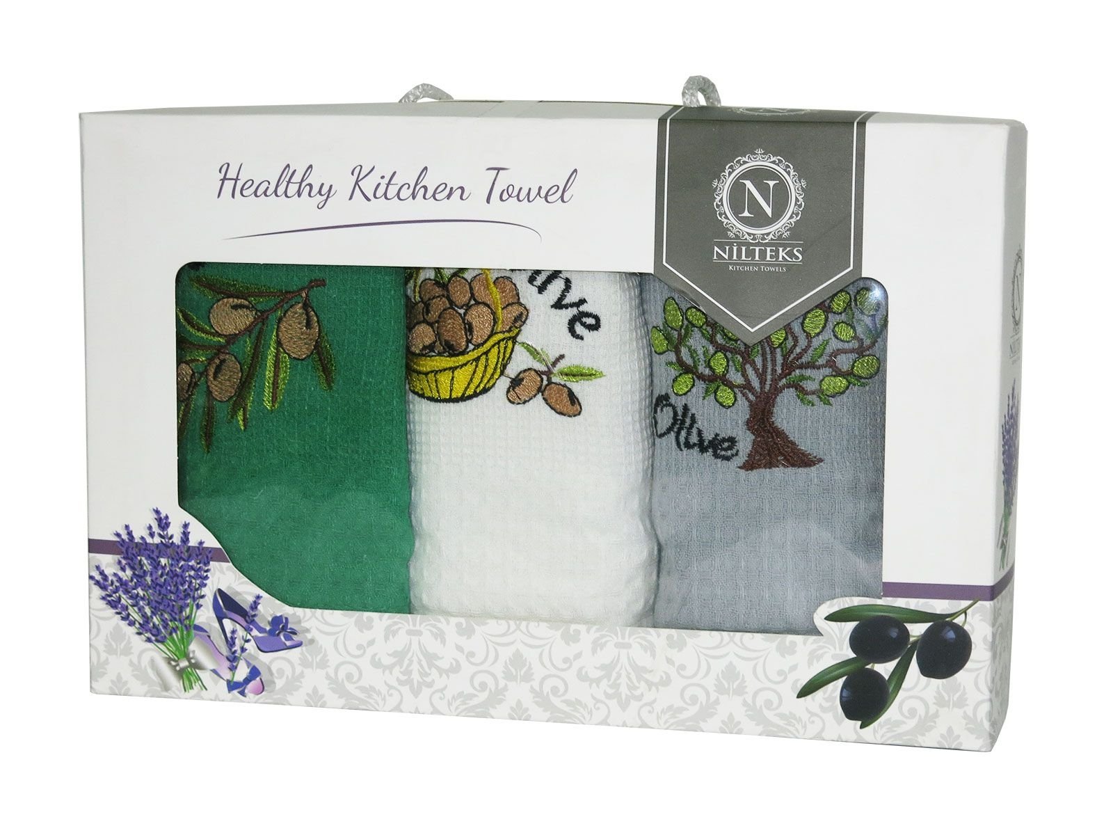 У комплект Nilteks Оливка входять 3 вафельні рушники, виконані в різних кольорах. Рушники високої якості підходять як кухонні рушники.