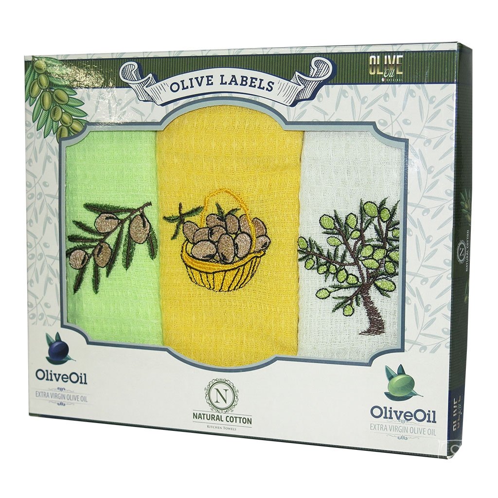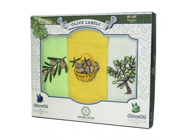 У кожному комплекті Nilteks Оливки входить 3 вафельні рушники, виконані в єдиній колірній гамі, безперечно, стануть чудовим придбанням дбайливої господині будинку. На всіх рушниках нанесено якісну вишивку у вигляді оливкових гілок. Рушники виготовлені з вафельного полотна та упаковані у гарну коробку з демонстраційним віконцем.