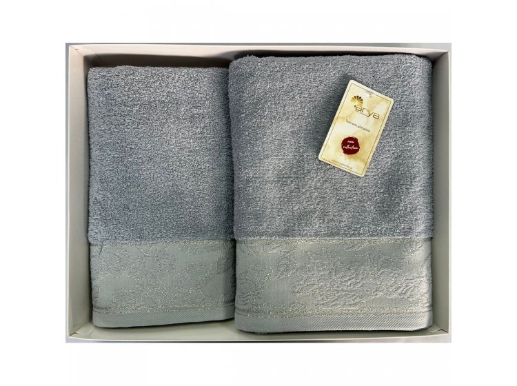 Набір рушників Arya Sena блакитного кольору, виконаний із 100% бавовни (махра) із жакардовим бордюром. Рушник високої якості, м'який на дотик, добре вбирає вологу. Щільність : 500 г/м2. Якість рушників гарантована всесвітньо відомим турецьким виробником – торговою маркою Arya.