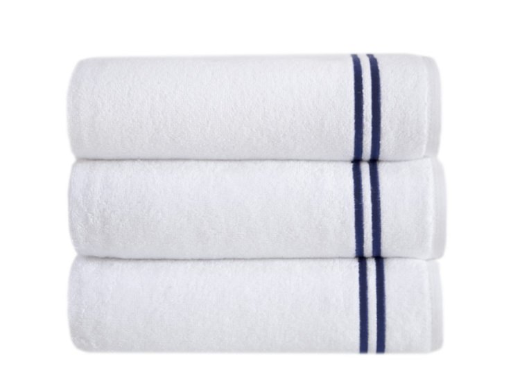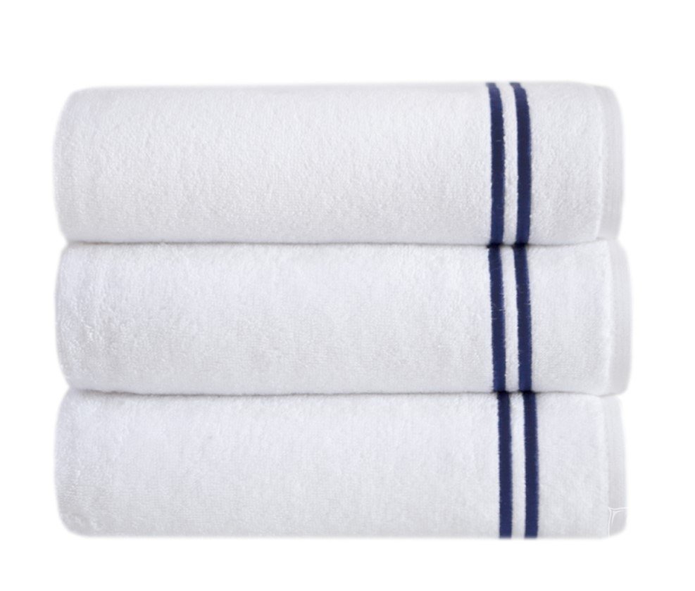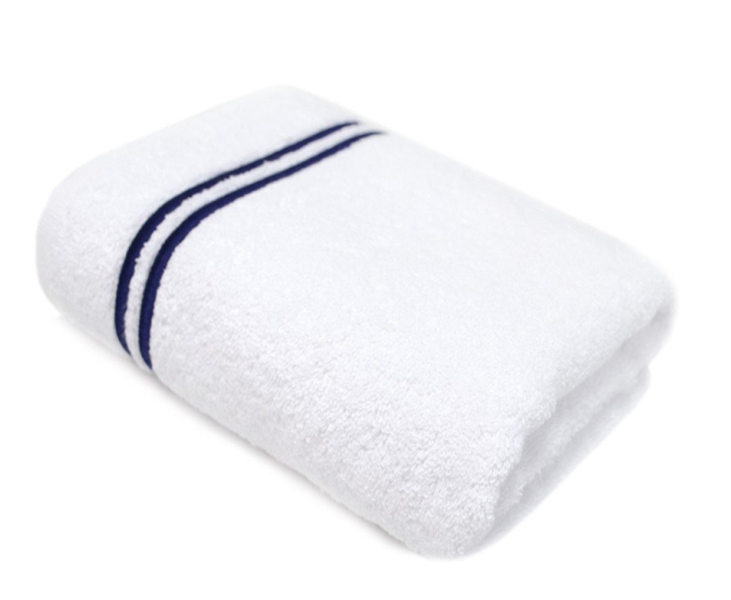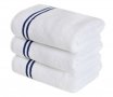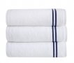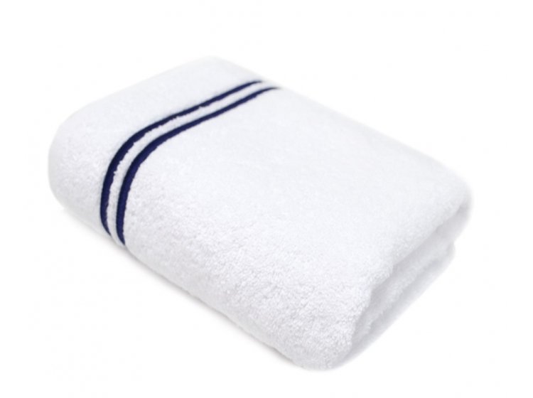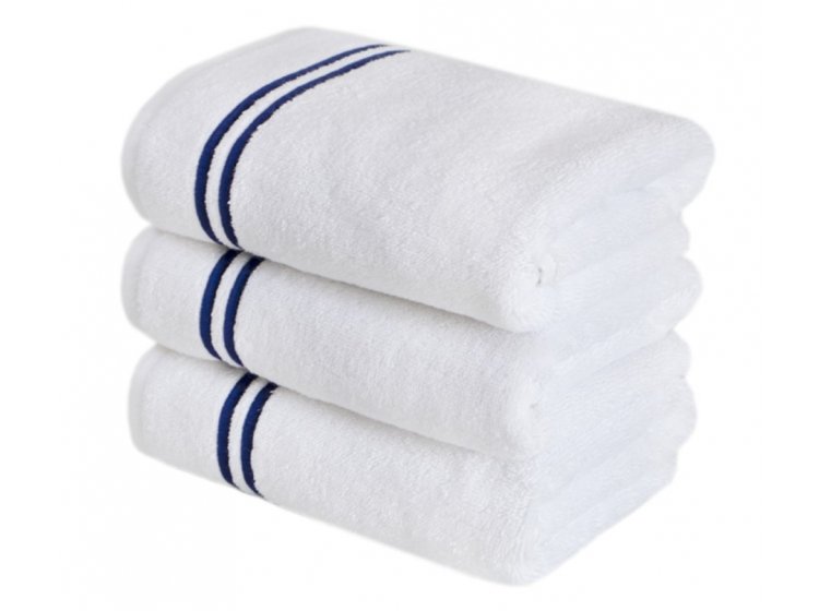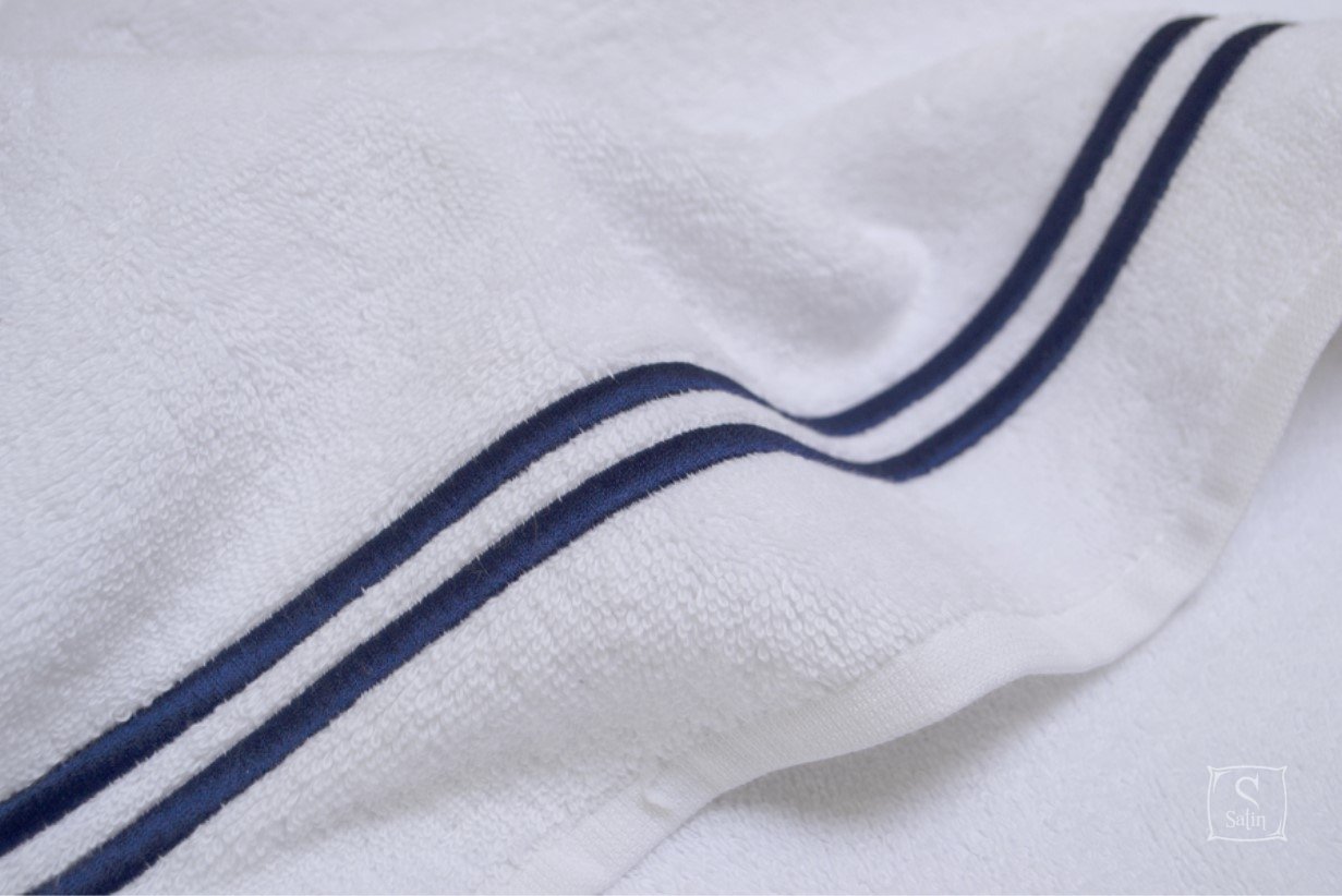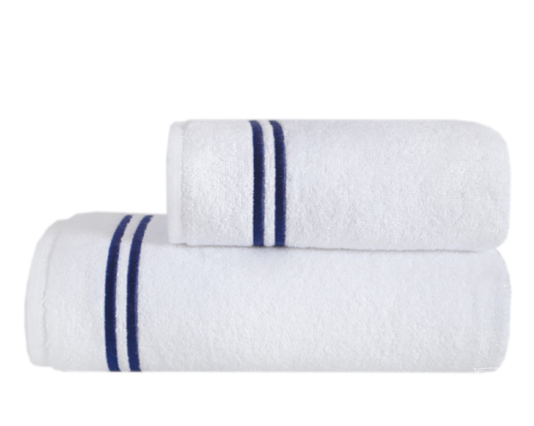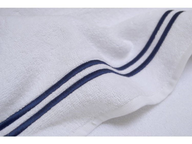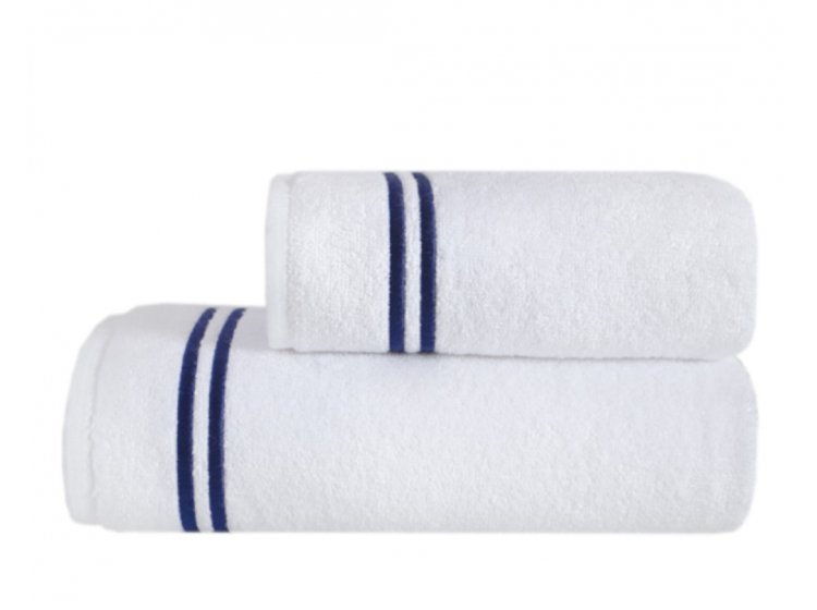 Махровий рушник Milano beyaz-lacivert від відомої турецької торгової марки MieCasa виконаний у білому кольорі з бавовняної махри (100% бавовна) високої щільності ( 500 г/м² ), прикрашений вишивкою у вигляді смужок синього кольору.