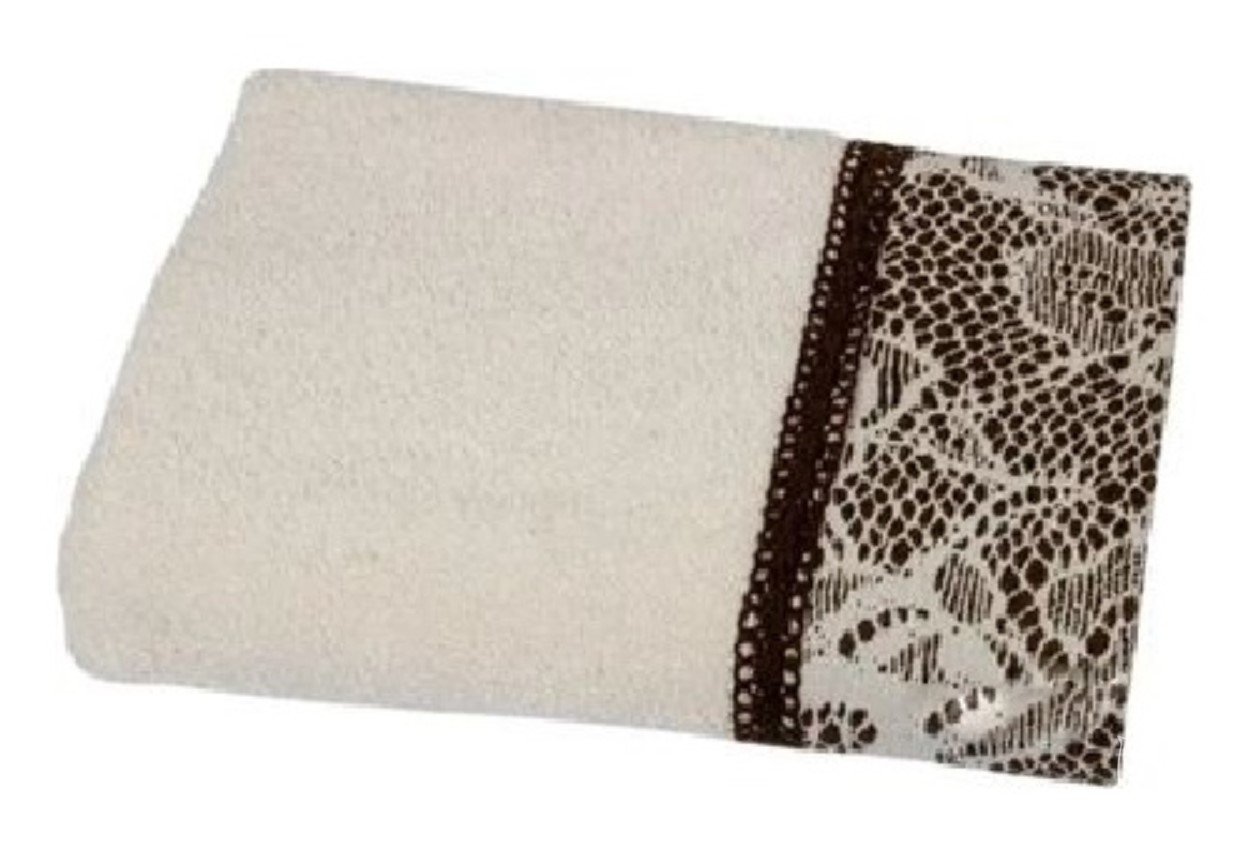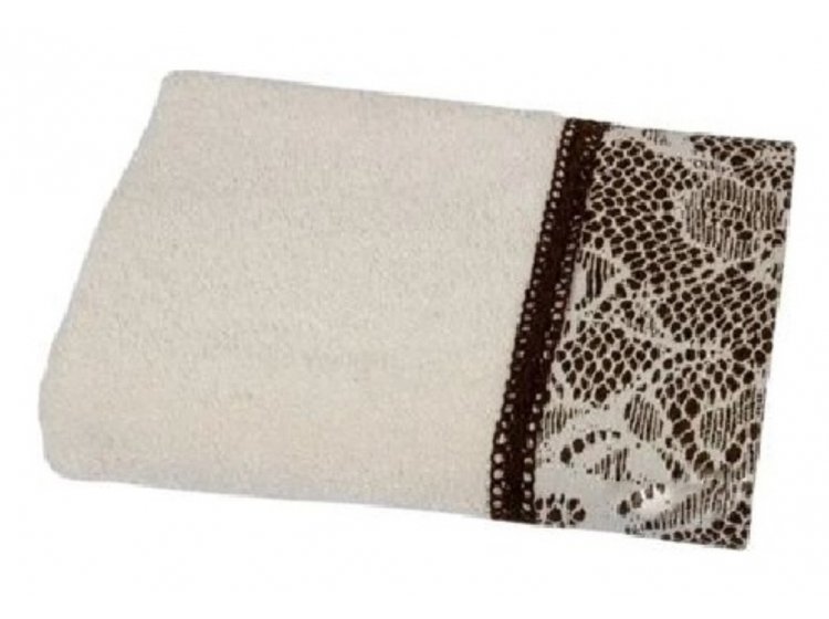 Махровий рушник Croсhet від турецької торгової марки Romeo Soft виконаний у молочному кольорі з бавовняної махри (100% бавовна) високої щільності ( 500 г/м² ), прикрашений коричневим мереживним бордюром.